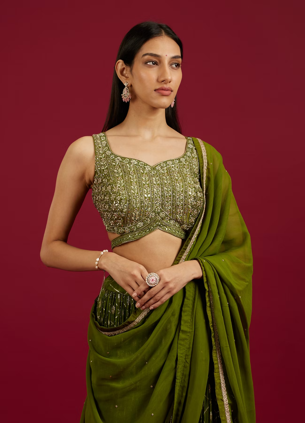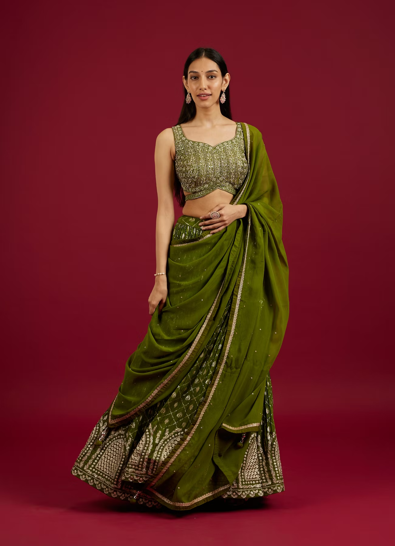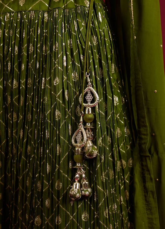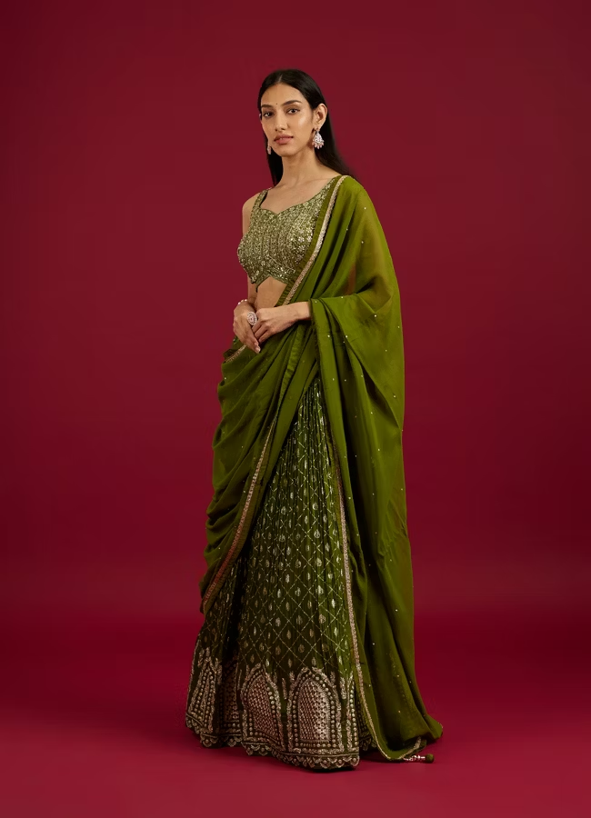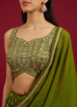 This exquisite green lehenga is crafted from luxurious art silk, making it a stunning choice for special occasions. The lehenga is adorned with intricate hand embroidery. Adding to its splendour, the lehenga features elaborate mirror work, delicate thread work which further enhances its beauty, with traditional patterns and motifs meticulously woven into the fabric. Pair it with the matching dupatta, statement jewellery, and elegant heels or traditional juttis to complete the look.