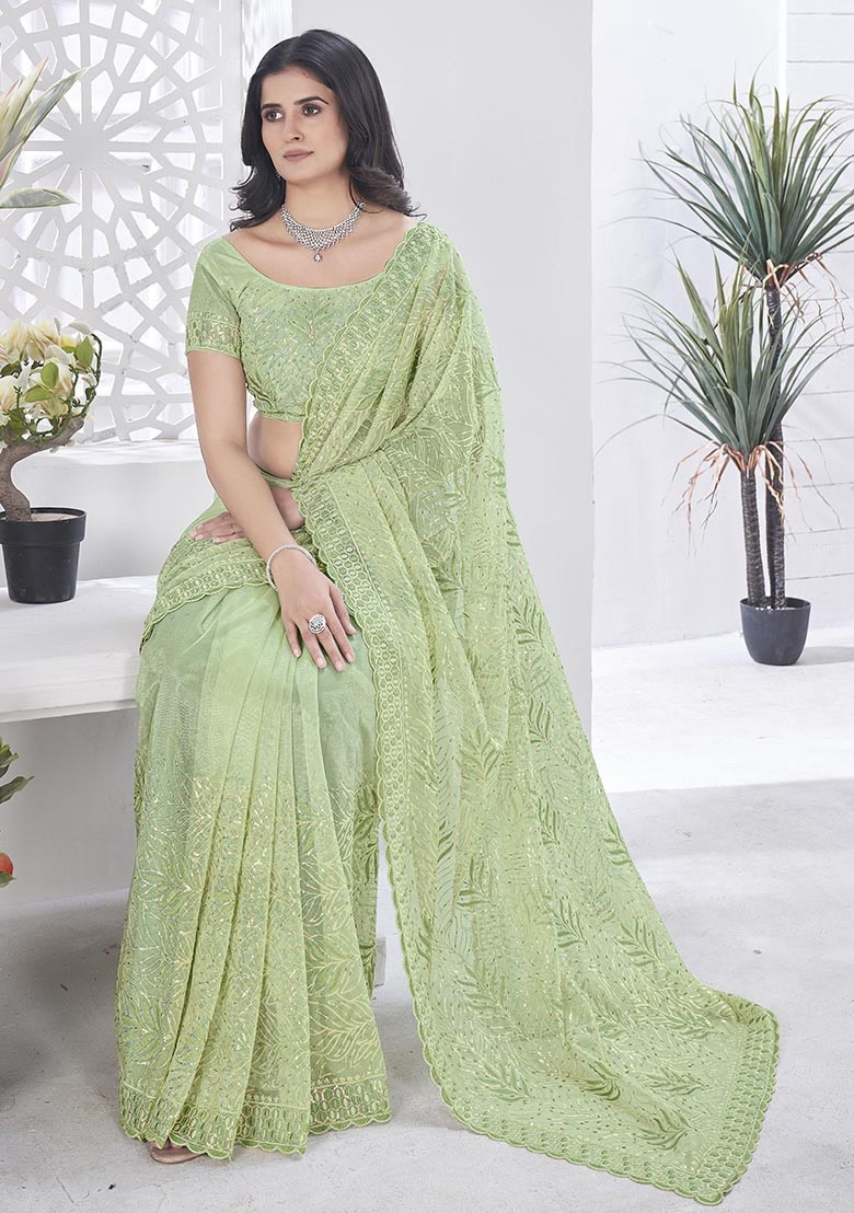 Green Sequin Thread Embroidered Tissue Net Saree Set – XSR24196