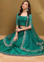 Embrace the festive spirit with this exquisite green solid lehenga set, paired with a matching cape. Crafted from luxurious silk Chanderi fabric, it offers a sophisticated silhouette that drapes effortlessly. This ensemble is a must-have for your wardrobe, perfect for making a stunning statement at parties or weddings, where elegance and style take center stage.