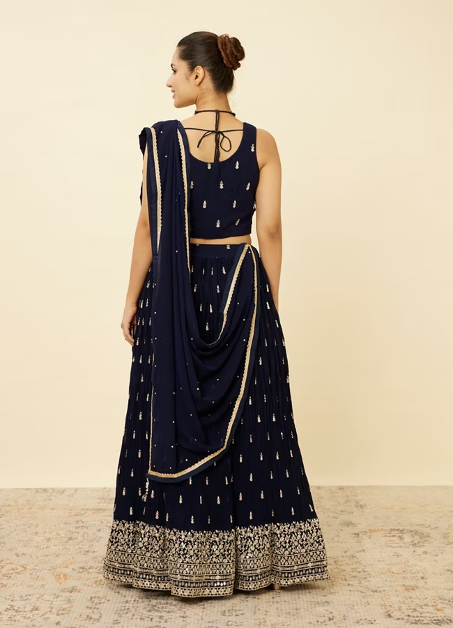- DescriptionBask in the richness of this indigo blue Lehenga, showcasing intricate fern-shaped embroidery, sequins, and golden embellished borders. Pair this with gold jewellery and matching shimmery heels for a glamorous look.