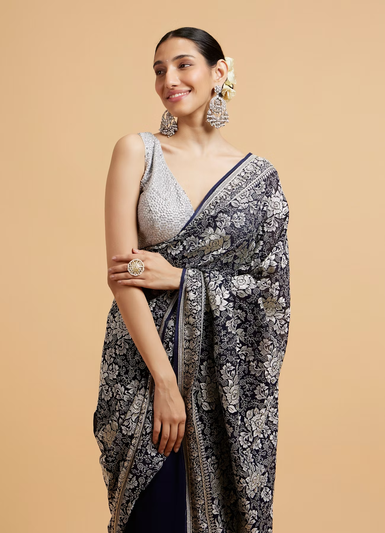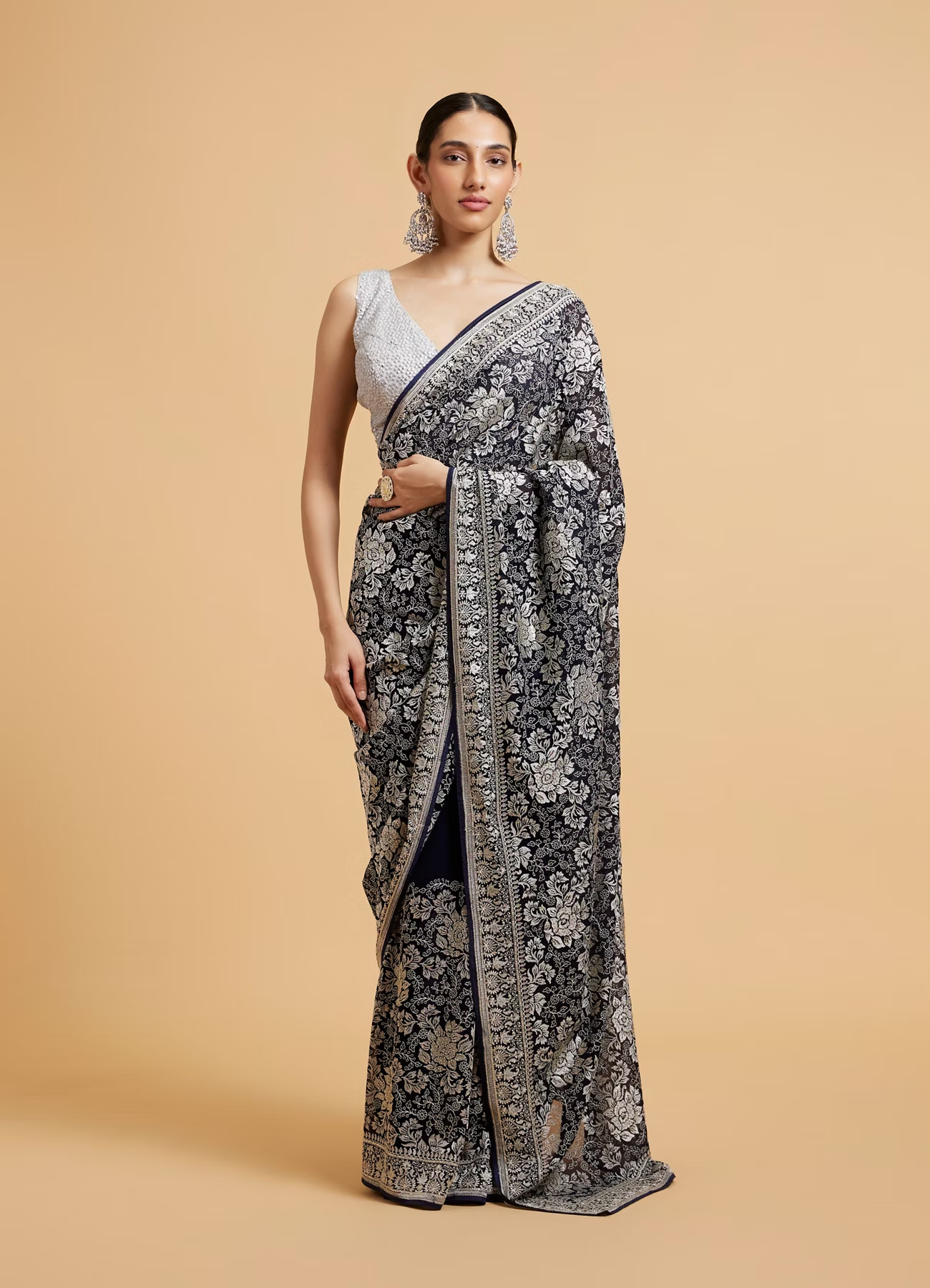 - DescriptionDiscover timeless elegance with our indigo blue floral patterned saree, beautifully adorned with shimmering sequin work. Crafted from soft, luxurious fabric, this saree drapes gracefully, making it perfect for both casual outings and festive celebrations. For an eye-catching ensemble, pair it with a contrasting blouse and statement earrings, letting the sequins and floral patterns sparkle as you step into any occasion.