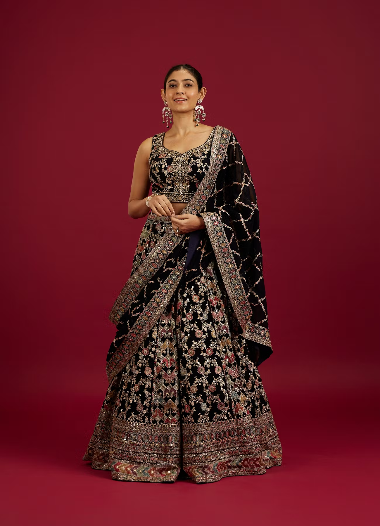 - DescriptionThis indigo blue jaal embroidered crop top lehenga is a stunning blend of intricate craftsmanship and modern elegance. The rich jaal embroidery, paired with shimmering sequin work, creates a captivating design that exudes luxury. The deep indigo hue adds a regal touch, making it perfect for weddings or festive celebrations. Pair it with statement gold jewelry and a sleek bun for a graceful, yet bold look that will leave a lasting impression.