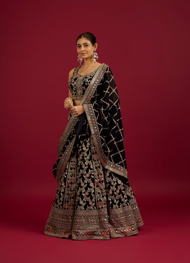 Indigo Blue Jaal Embroidered Crop Top Lehenga with Sequin Work
