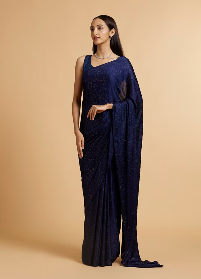 - DescriptionElevate your style with this indigo blue rhinestone embellished saree, perfect for any festive or formal occasion. The rich indigo blue drape is adorned with delicate rhinestones that shimmer with every movement, adding a touch of glamour. Pair this saree with silver or diamond jewelry and a sleek bun for an elegant and polished look.
