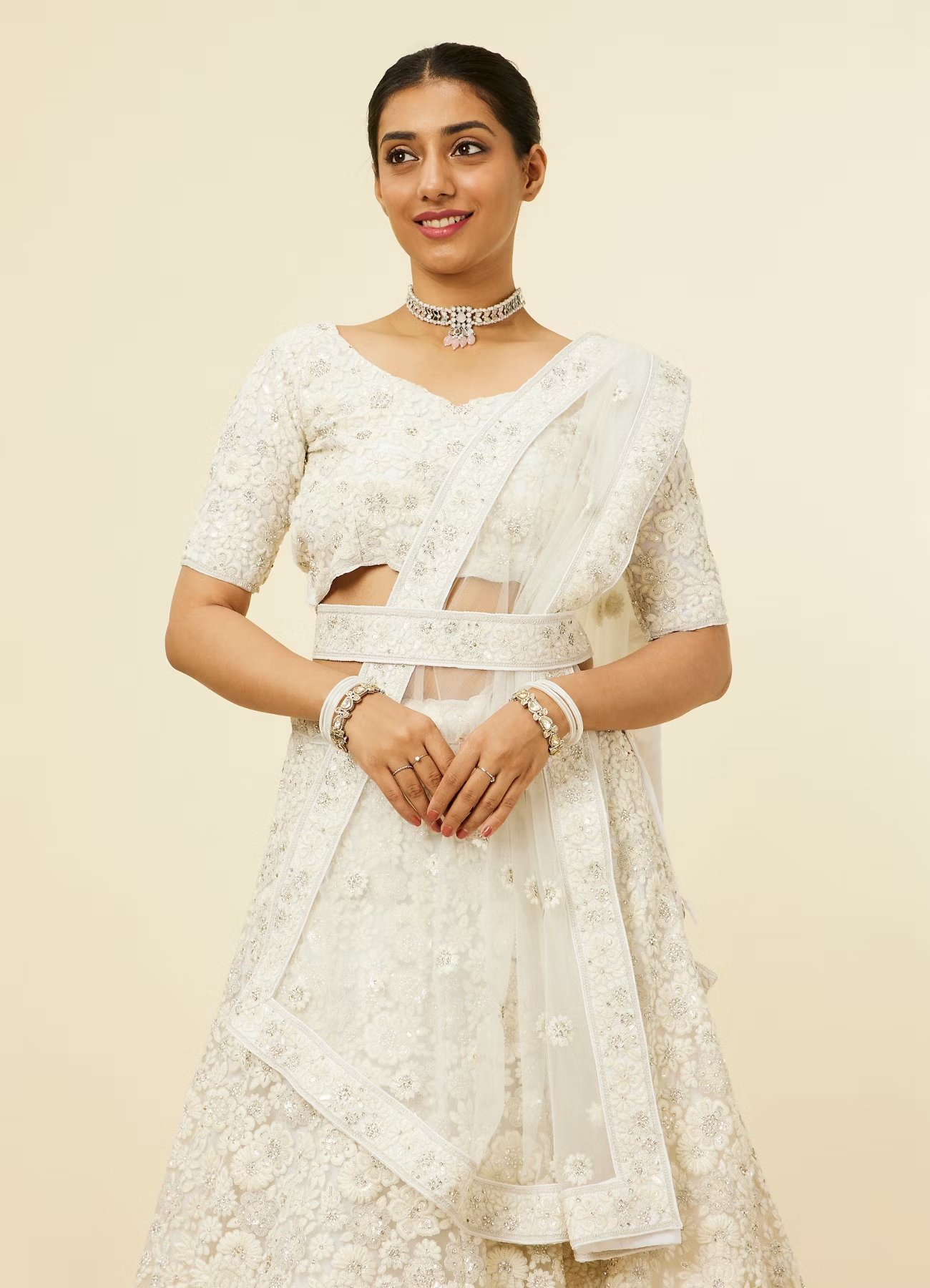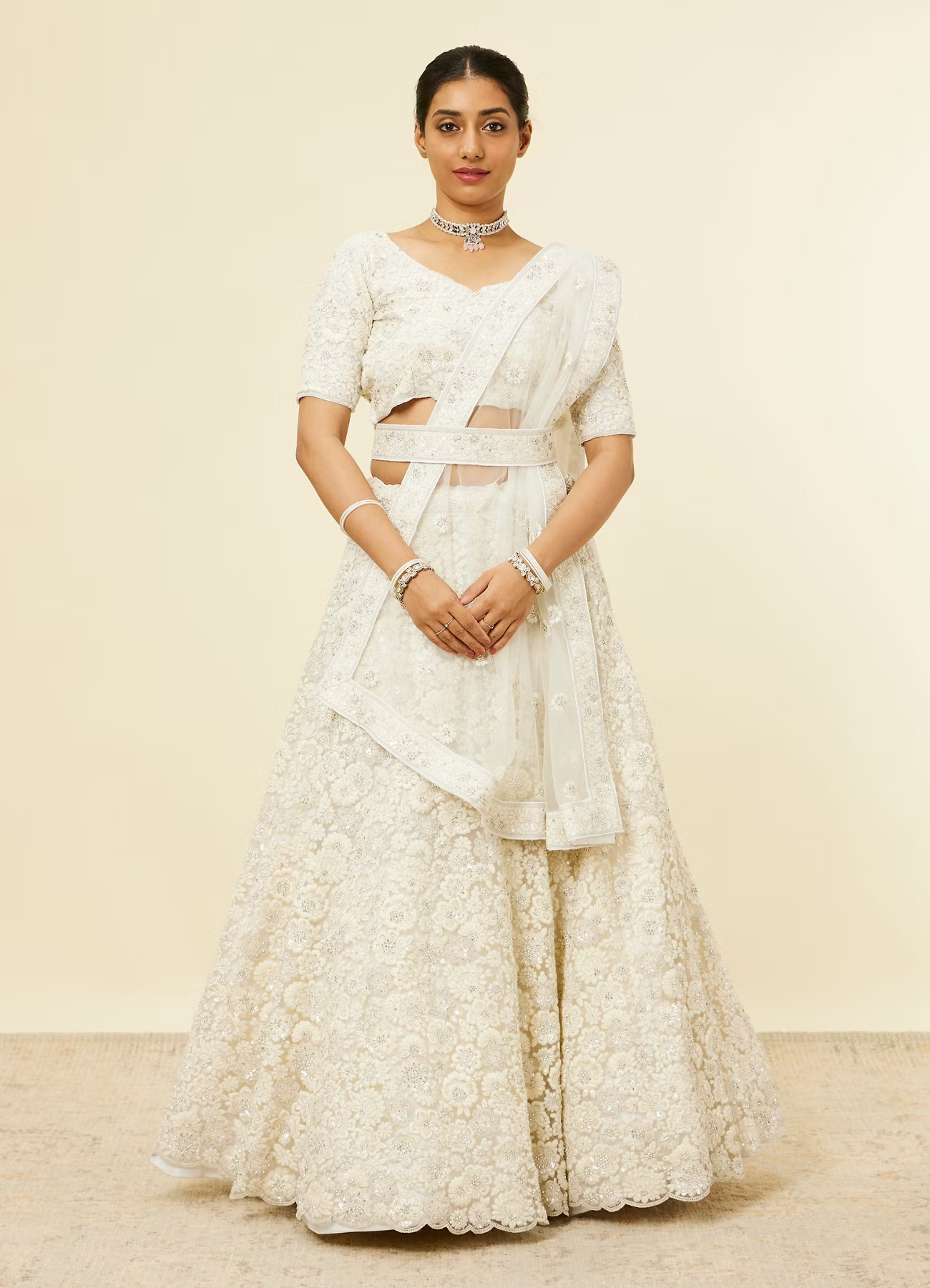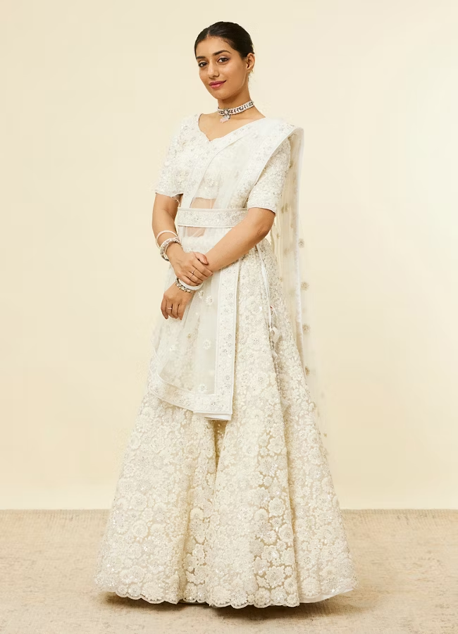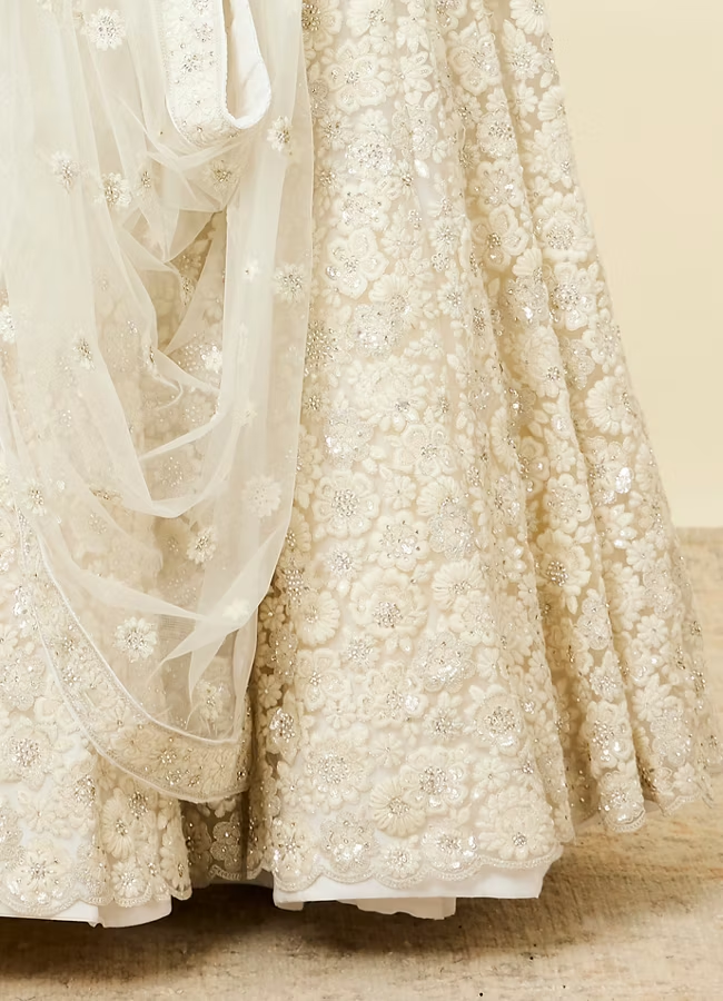 • DescriptionCreating a rich tapestry of designs across the fabric, this Ivory cream lehenga displays a stunning floral print all over, further the lehenga is embellished with rhinestone work complemented with a pillow trm latkans. The variety of patterns offers a unique and visually striking appearance, making this lehenga is a perfect choice for occasions that call for an elegant outfit. Style this with silver jewellery and block heels.