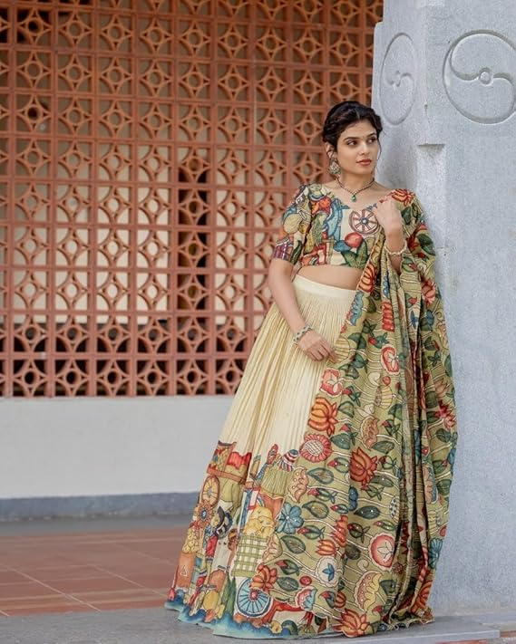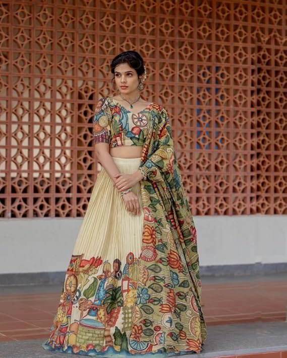 KrishuEthnics Peachish Kalamkari Print Chinon Silk Lehenga Choli