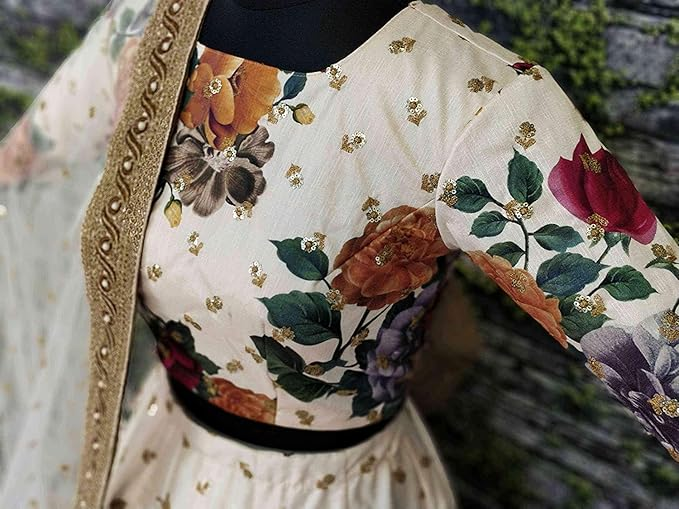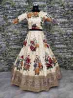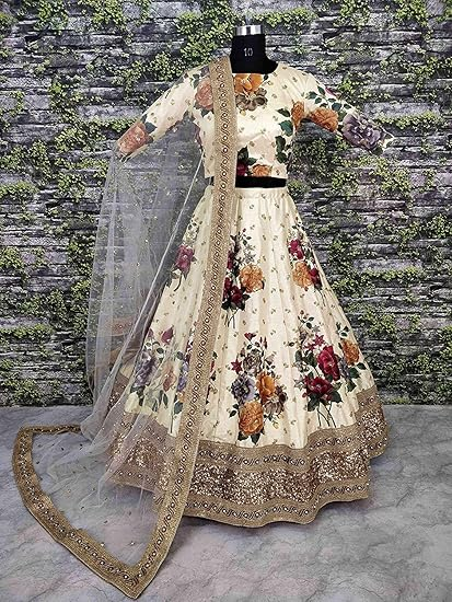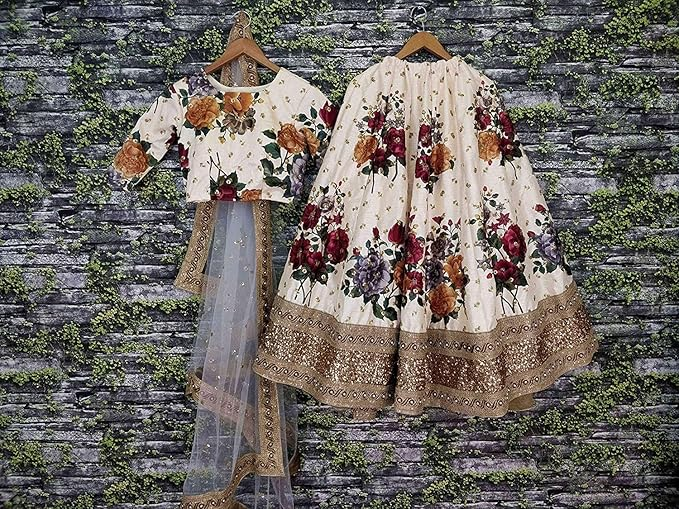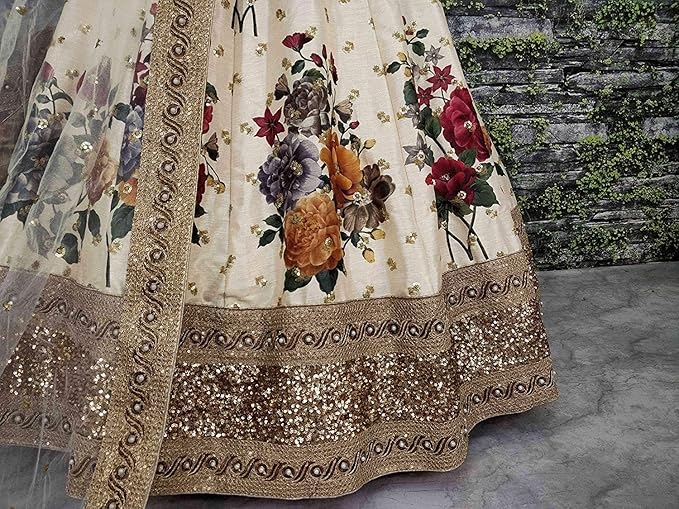 - Description :- Lehenga : Ready to Wear || Fabric : Fine Art Silk || Embellishment : Digital print and Embroidered with Dori and Sequins || Style : A-Line || Inner : Satin with can-can layered net || Flair : 3.50mtr || Blouse : stitched || Fabric : Raw Silk || Embellishment : Dori, Sequins & Heavily Embroidered with Threads and Jari || Sleeves : Embroidered edged with Velvet Lace