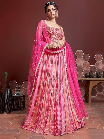 - The Indian Women Umbrella Lehenga in Pink Art Silk Bandhini with Lehariya Print is a stunning and traditional ensemble that epitomizes the rich cultural heritage of Indian fashion. This exquisite set includes a lehenga choli and dupatta each meticulously crafted to create a harmonious and eyecatching outfit perfect for festive occasions and celebrations. The primary fabric used in this ensemble is Art Silk a synthetic fiber designed to mimic the luxurious feel and appearance of natural silk.