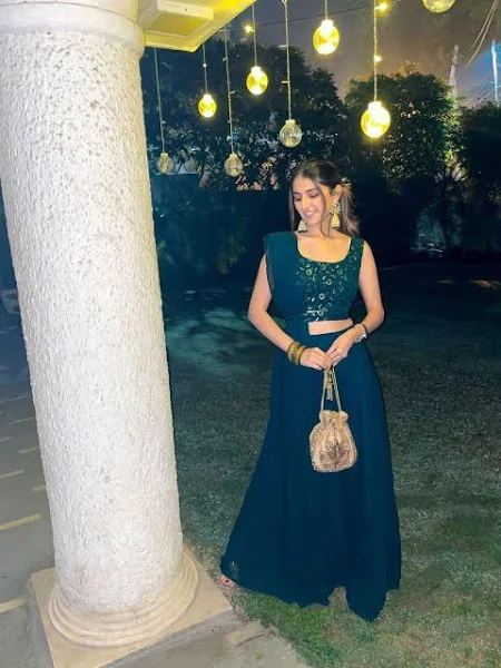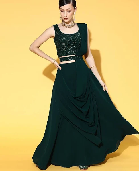 Elevate your ethnic glamour with this lehenga set, featuring a sequin-embellished blouse and a solid dupatta that adds a touch of opulence to the ensemble. The sleeveless blouse has a round neckline, an open back, and a hook closure, while the lehenga has a partially elasticated waistband. The intricate sequin detailing on the blouse beautifully complements the lehenga, making this set a stunning choice for festive occasions and celebrations.