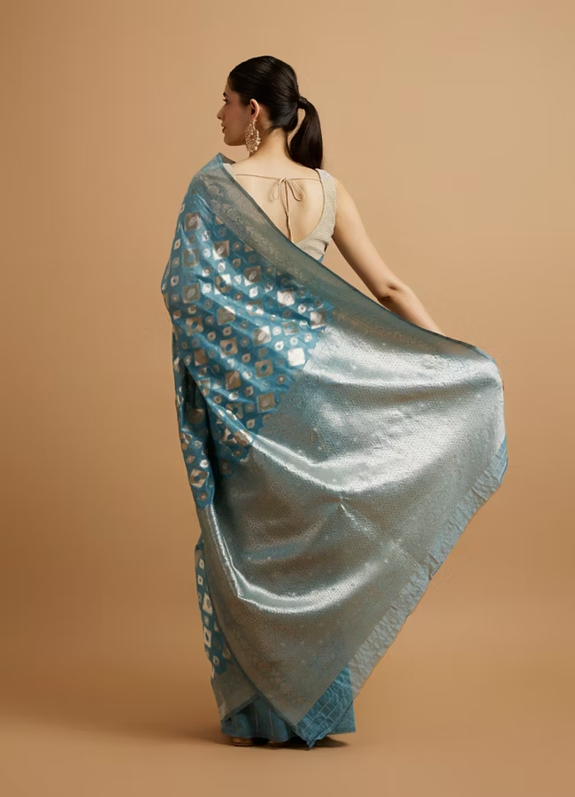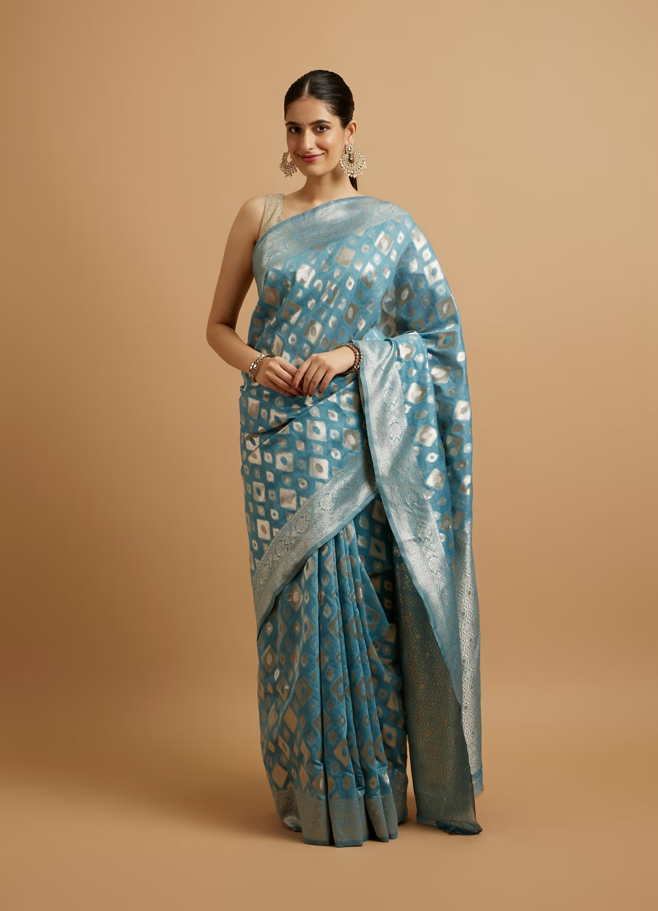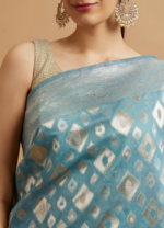 - DescriptionThis light blue saree features a stunning Ikat diamond pattern, combining traditional craftsmanship with modern elegance. The geometric design adds visual interest and sophistication to the fabric. Pair this saree with silver jewelry and a sleek hairstyle to highlight the intricate Ikat pattern, perfect for both casual gatherings and festive occasions where you wish to make a stylish statement.