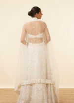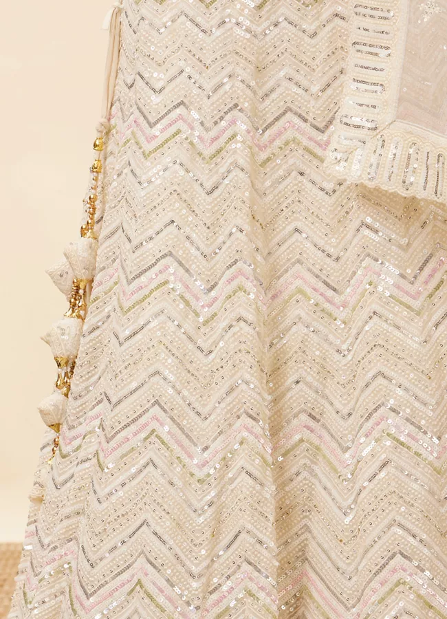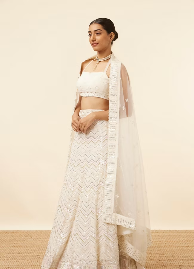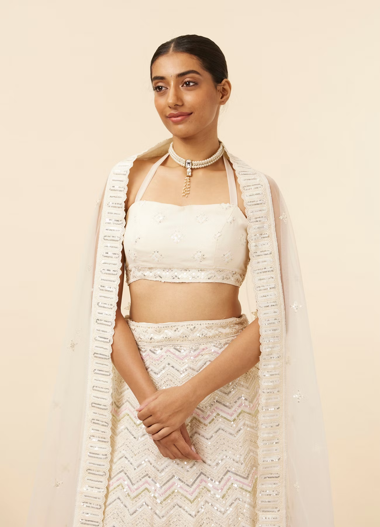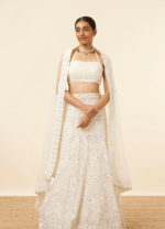- DescriptionGradient panels embedded with embellished metallic patterned embroidery adds rhythmic elegance to this sugar swizzle cream coloured lehenga. A sleek border outlines the skirt. A princess cut sweetheart neck strappy blouse with buti motifs, and a matching waist belt complement the outfit. Put together with a soft cream net dupatta, this lehenga is ideal for summertime wedding celebrations.