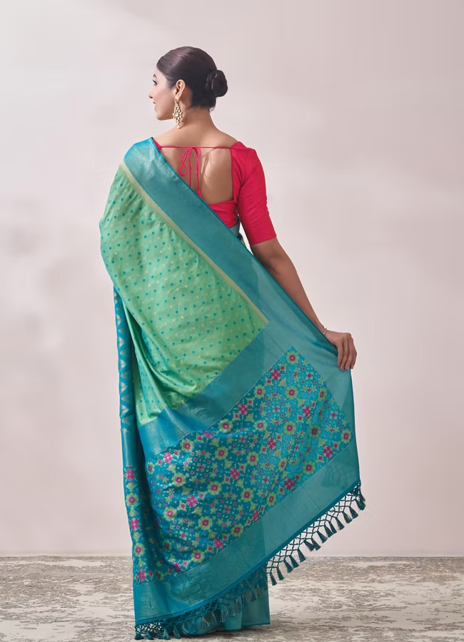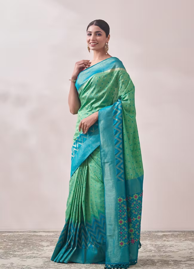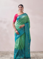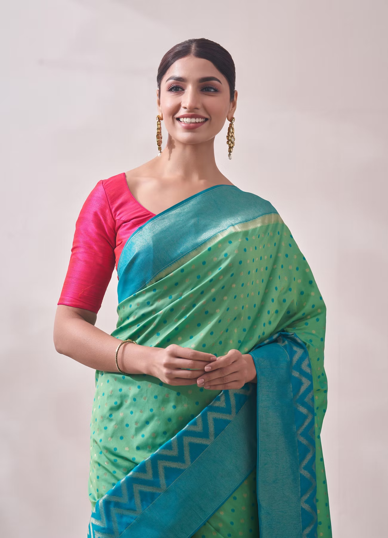 - DescriptionPrepare to captivate the crowd at any festive occasion with this striking Rama Green Saree. Crafted from luxurious silk and adorned with opulent design details, it is a grand choice for Mehendi celebrations or similar events. The head-turning hue complements the rich fabric, resulting in a Saree that’s nothing short of spectacular. Express your style and elegance with this beautiful ensemble.