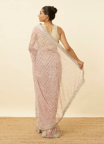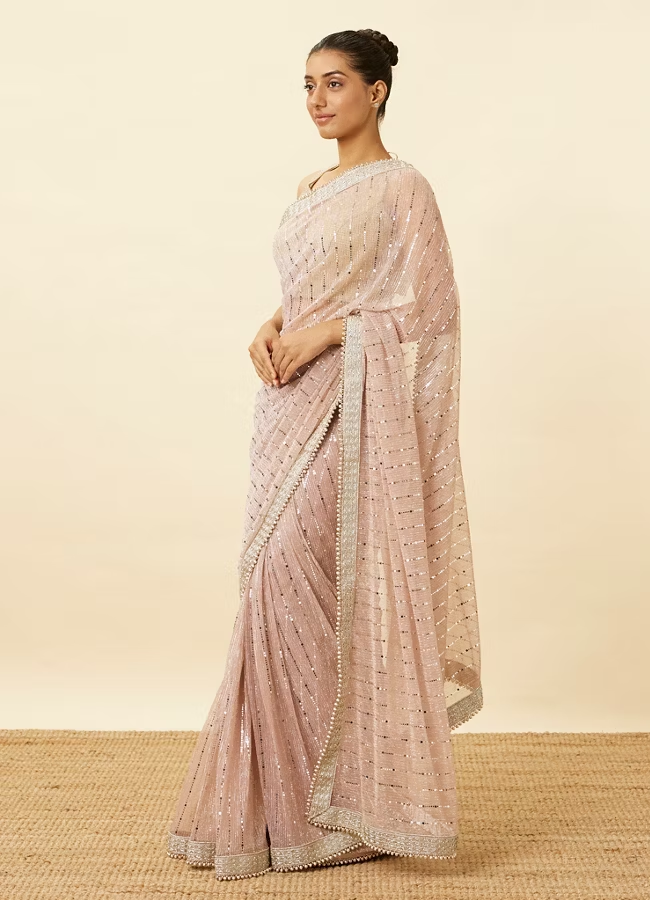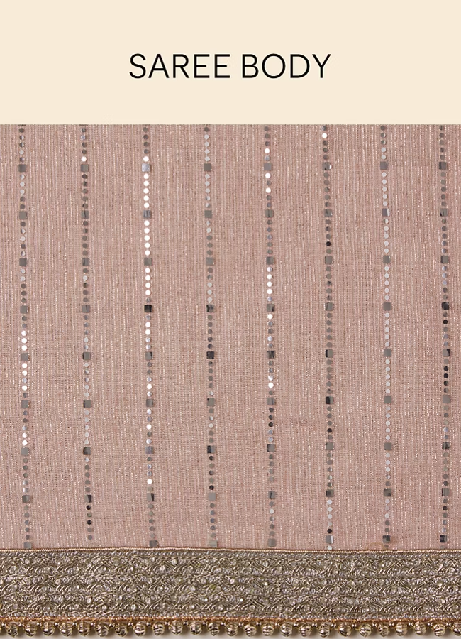 - DescriptionAdorned with dazzling mirror work and ornate borders, this light lilac saree is magnificently whimsical. Complement the shimmering elements of this saree with silver-toned jewellery and metallic heels.