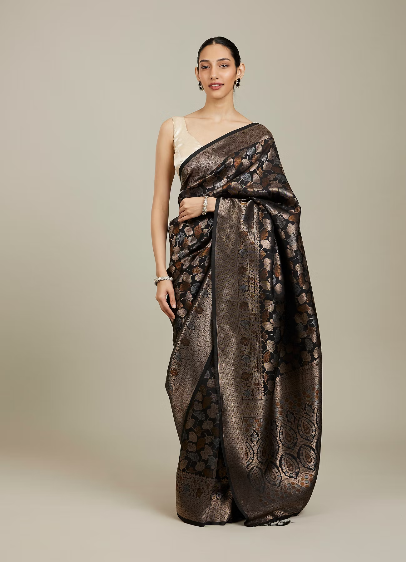 - DescriptionCreating a rich tapestry of designs across the fabric, this midnight black saree displays a stunning mix of lotus leaf, chaukadi, hexagon, floral, and medallion patterns. The variety of patterns offers a unique and visually striking appearance, making this saree a perfect choice for occasions that call for an elegant outfit. Style this with antique gold jewellery and block heels.