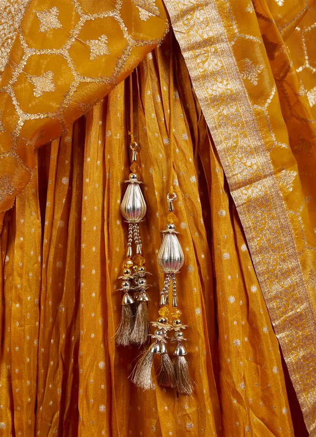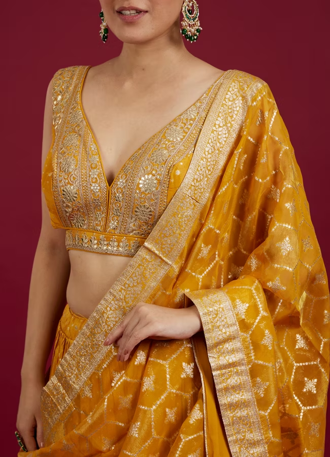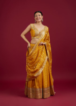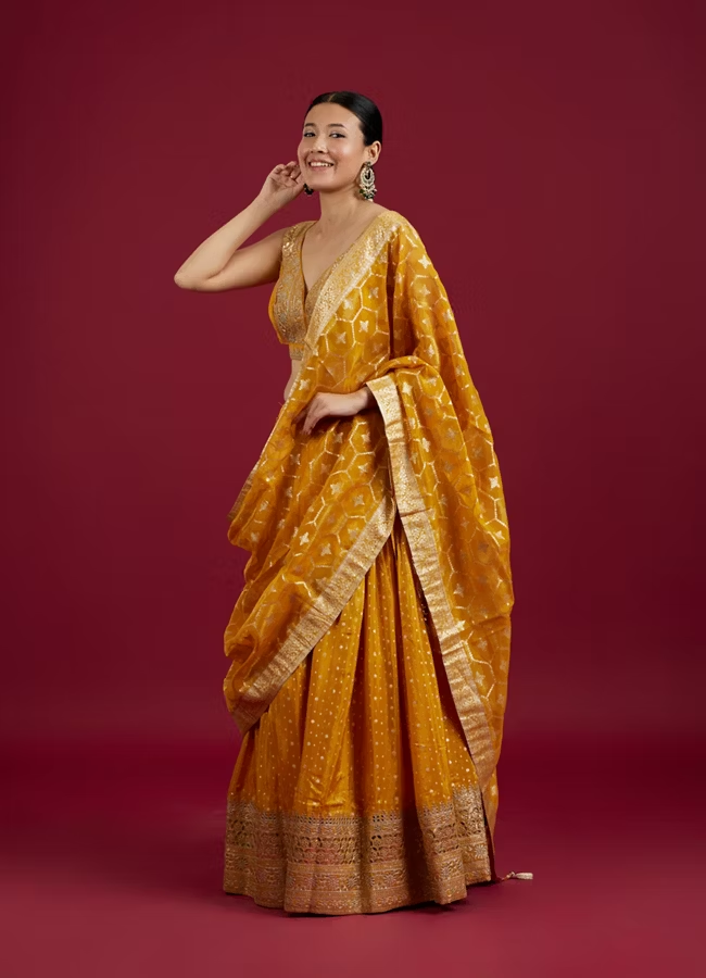 - DescriptionThis magnificent Mustard Lehenga, crafted from fine silk, will be a standout piece for your Haldi celebration or a grand wedding. The ornate embroidery, shimmering zari, and sequin work magnify its royal appeal. The set includes an embroidered top and a flared Lehenga, coordinated with a matching Dupatta. Perfect for those festive moments!