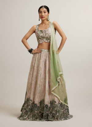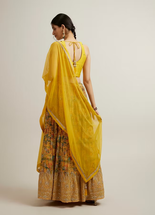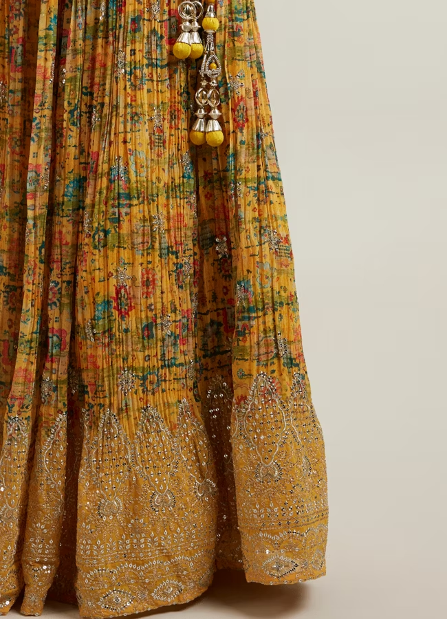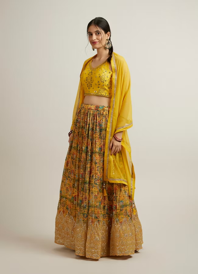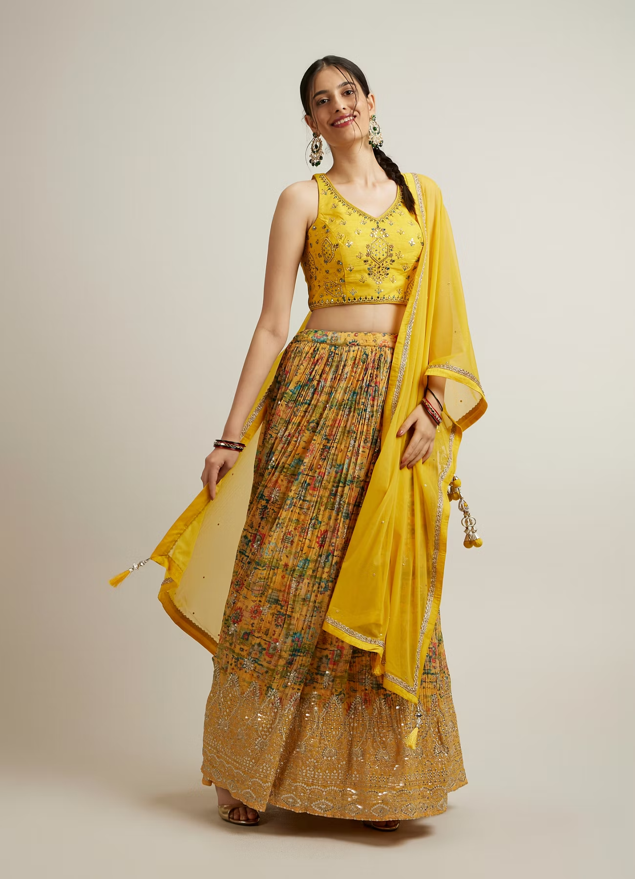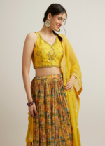- DescriptionTurn heads in this eye-catching Mustard Georgette Lehenga, ideal for Haldi festivities. The design boasts intricate hand embroidery, mirror, stone, thread work, and sequins, layered over cheerful prints. It’s accompanied by a matching top and dupatta, making you the center of attraction. Subtle yet striking, this Lehenga skilfully combines tradition and style for maximum impact.