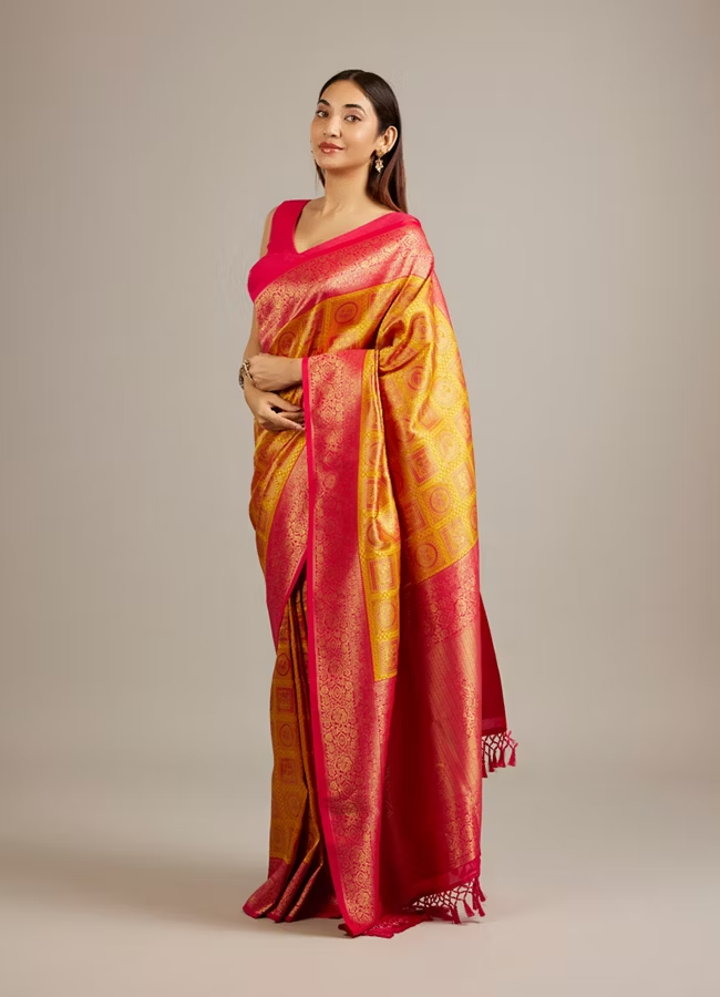 Be the first to review “Mustard Yellow Jaal Patterned Saree with Square Motifs And Bel Buti Borders” Cancel reply
