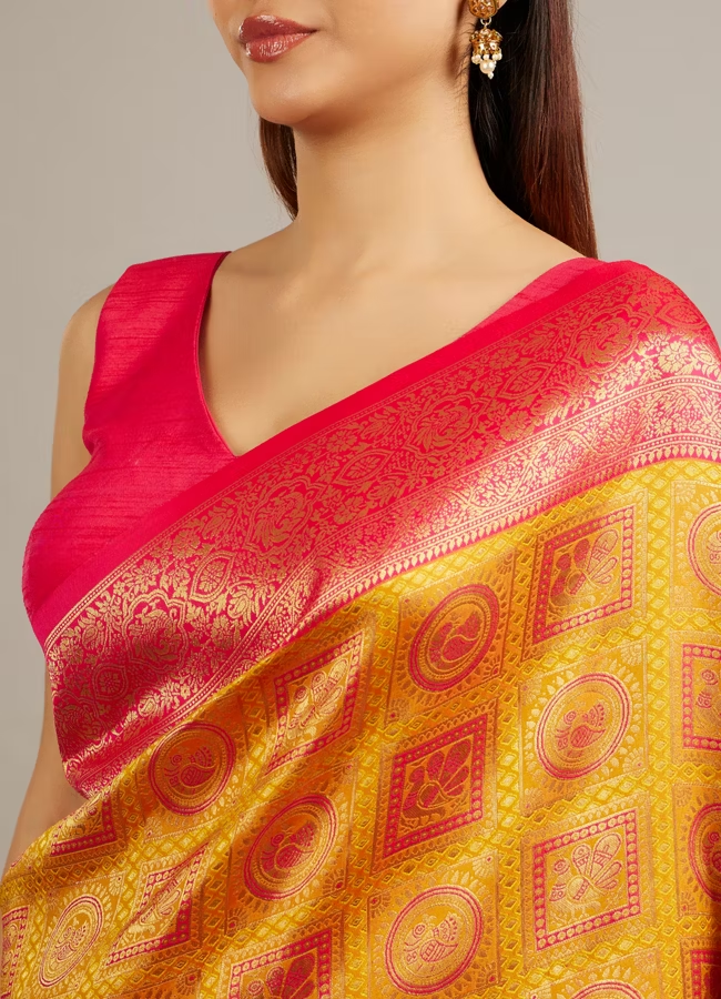 Mustard Yellow Jaal Patterned Saree with Square Motifs And Bel Buti Borders