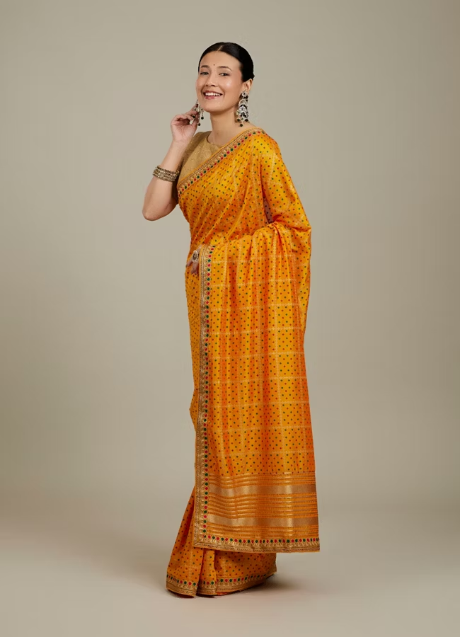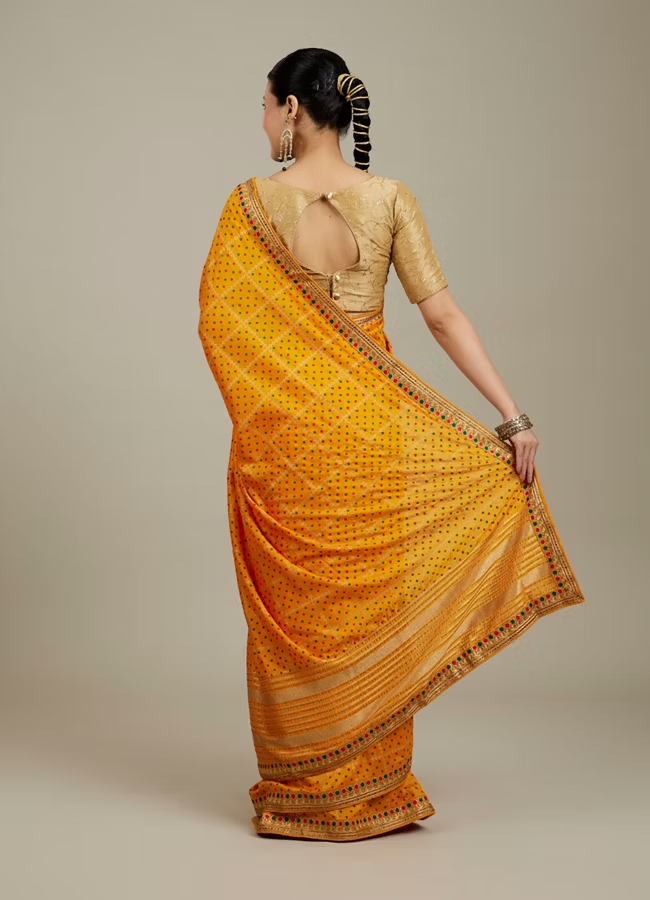 Mustard Yellow Linear Patterned Bandhani Saree with Rhinestone Work