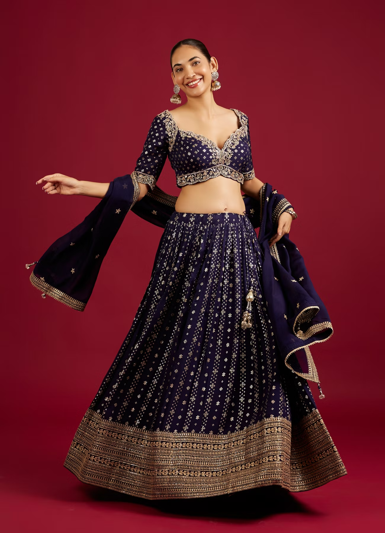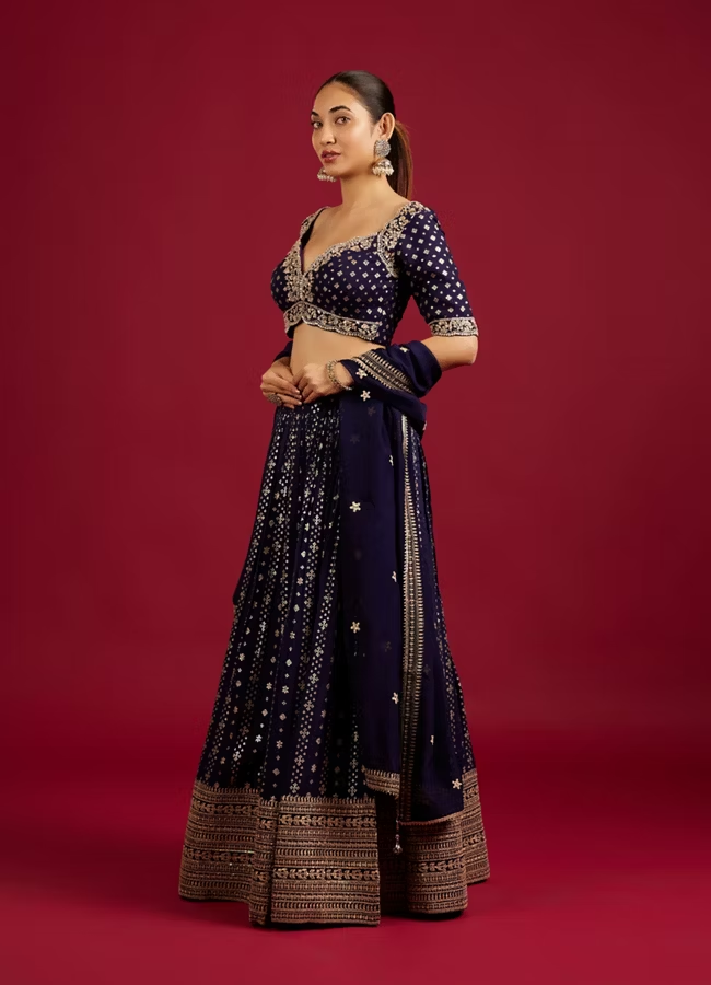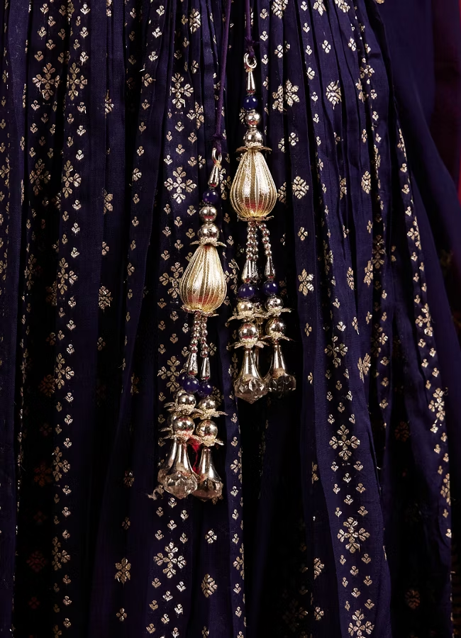 - DescriptionDrape yourself in regal elegance with this nightshade purple crop top lehenga, adorned with delicate floral buta patterns that exude charm. The zari-embroidered borders add a touch of opulence, making it a perfect pick for festive soirees and wedding celebrations. Style it with chandelier earrings, a sleek clutch, and soft curls for a mesmerizing look that turns heads with every twirl.