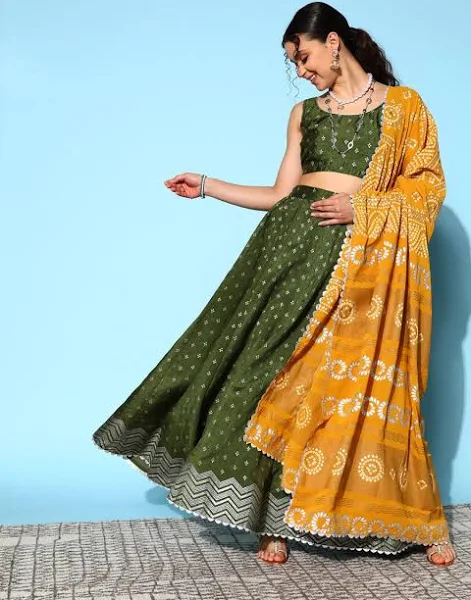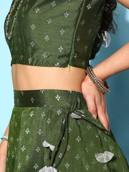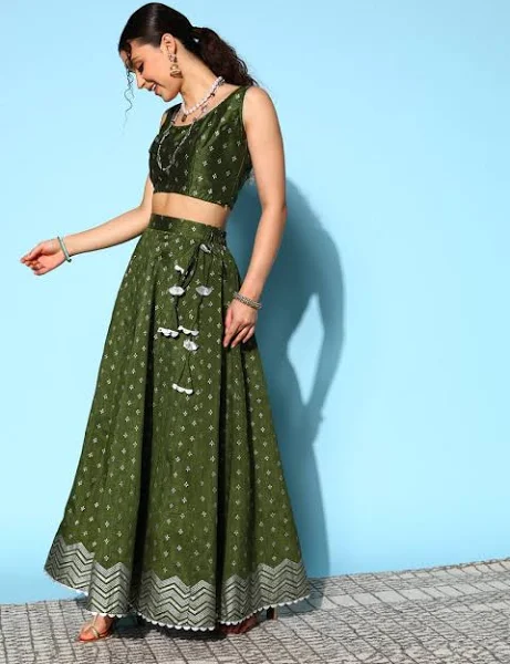 Olive Green & Silver-Toned Printed Ready to Wear Lehenga & Blouse With Dupatta-AHBLDUSK-COMBO-538-FF
