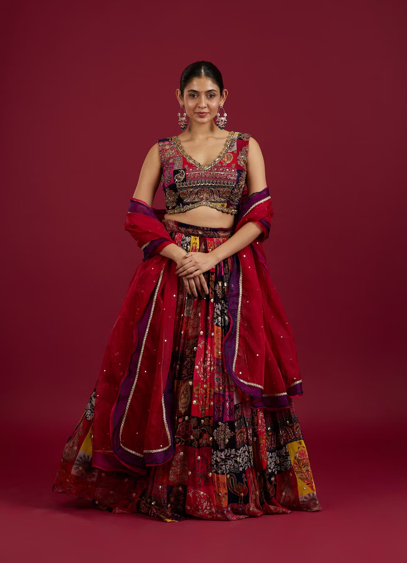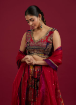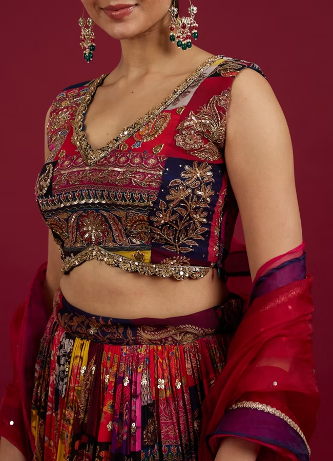 - DescriptionThis orange floral printed Lehenga features a beautifully designed skirt,adorned with a floral print, paisley and peacock motifs. The set includes a V neck blouse with sequin work on its sleeveless design, adding a touch of sparkle. The matching dupatta completes the ensemble. Style it with minimal gold jewellery and sleek golden heels.