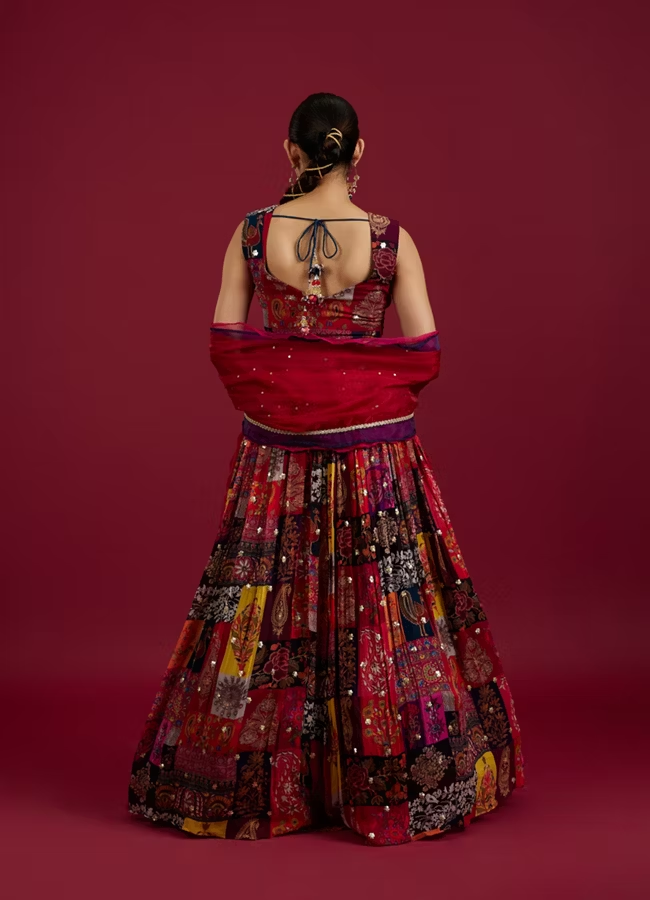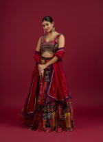 This orange floral printed Lehenga features a beautifully designed skirt,adorned with a floral print, paisley and peacock motifs. The set includes a V neck blouse with sequin work on its sleeveless design, adding a touch of sparkle. The matching dupatta completes the ensemble. Style it with minimal gold jewellery and sleek golden heels.