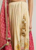 Embrace timeless elegance with this dark cream floral crop top lehenga set. The blouse is adorned with intricate mirror work, perfectly complemented by the lehenga’s subtle sequin detailing. The ensemble is completed with a delicate pink dupatta featuring buta motifs and tassel trims, adding a touch of traditional charm. Perfect for festive occasions, this set exudes a sophisticated yet vibrant vibe. Pair with statement earrings and a sleek bun for a refined, festive look.