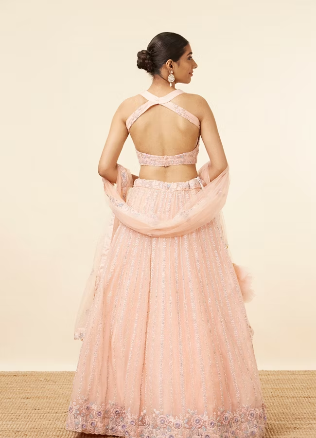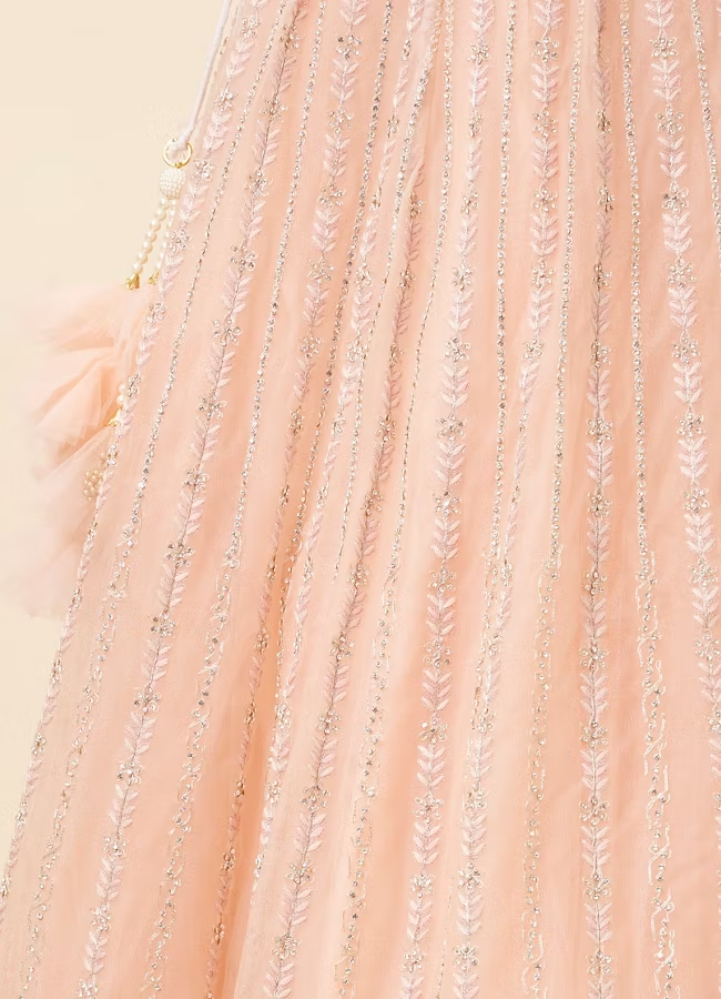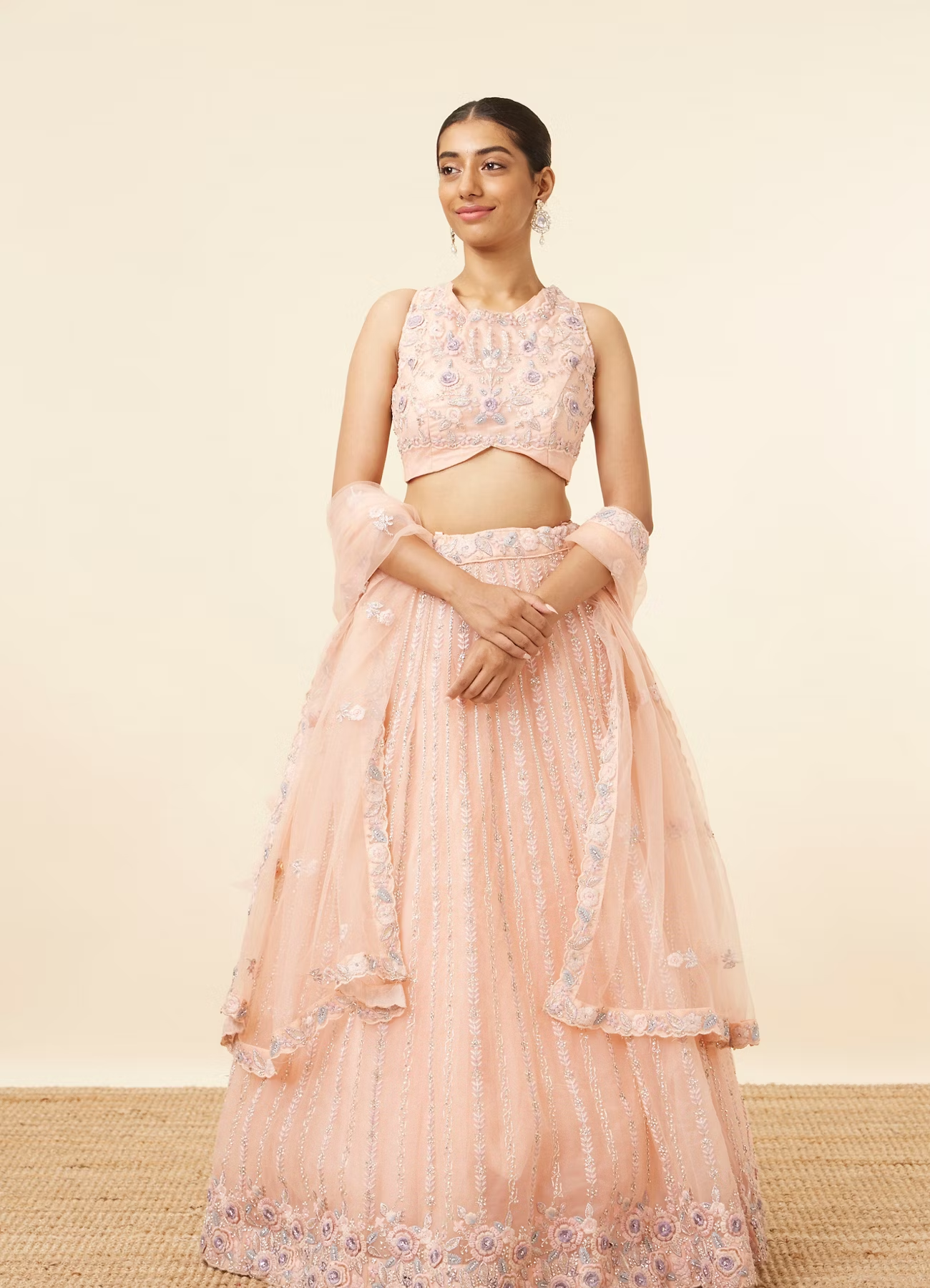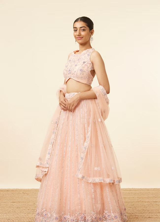 - DescriptionThis peach coloured lehenga crafted from fine net fabric is splendidly decorated with sparkling embellishments. The patterns are adorned with sequins and sheeny embroidery in a vertical pattern. Floral motifs grace the border bringing a majestic appeal to the skirt and the tassels decorate the waist tie. The blouse is ornamented with complementing embroidery and features an embellished neckline. A matching dupatta completes the ensemble.