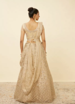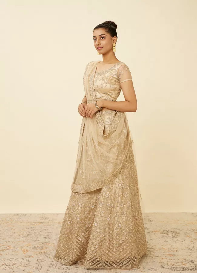 Indulge in the understated elegance of this pearled ivory white lehenga, adorned with bel buti patterns and rhinestone work. Pair it with pearl accessories for an ethereal, vintage appeal.