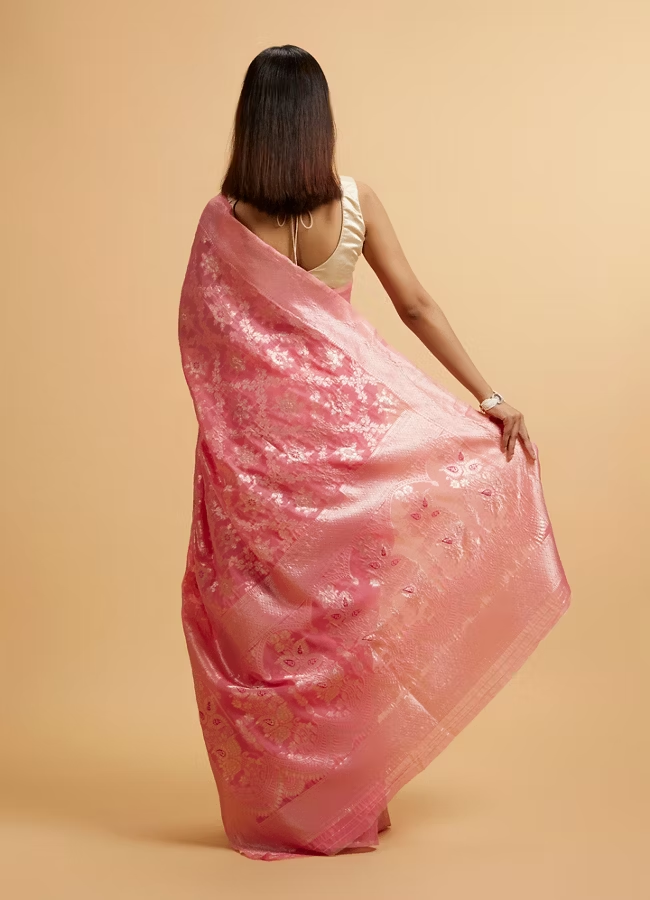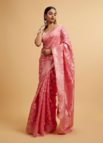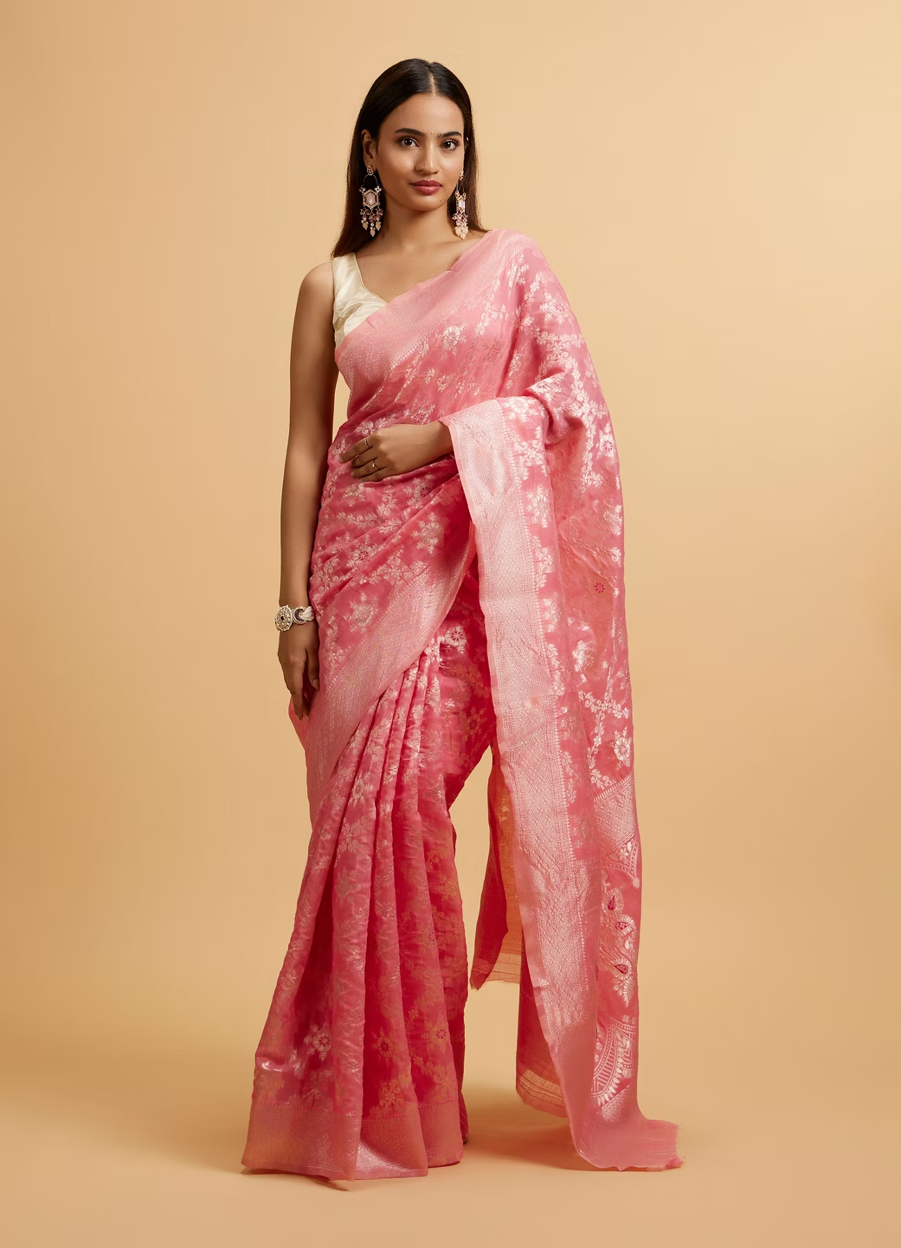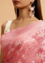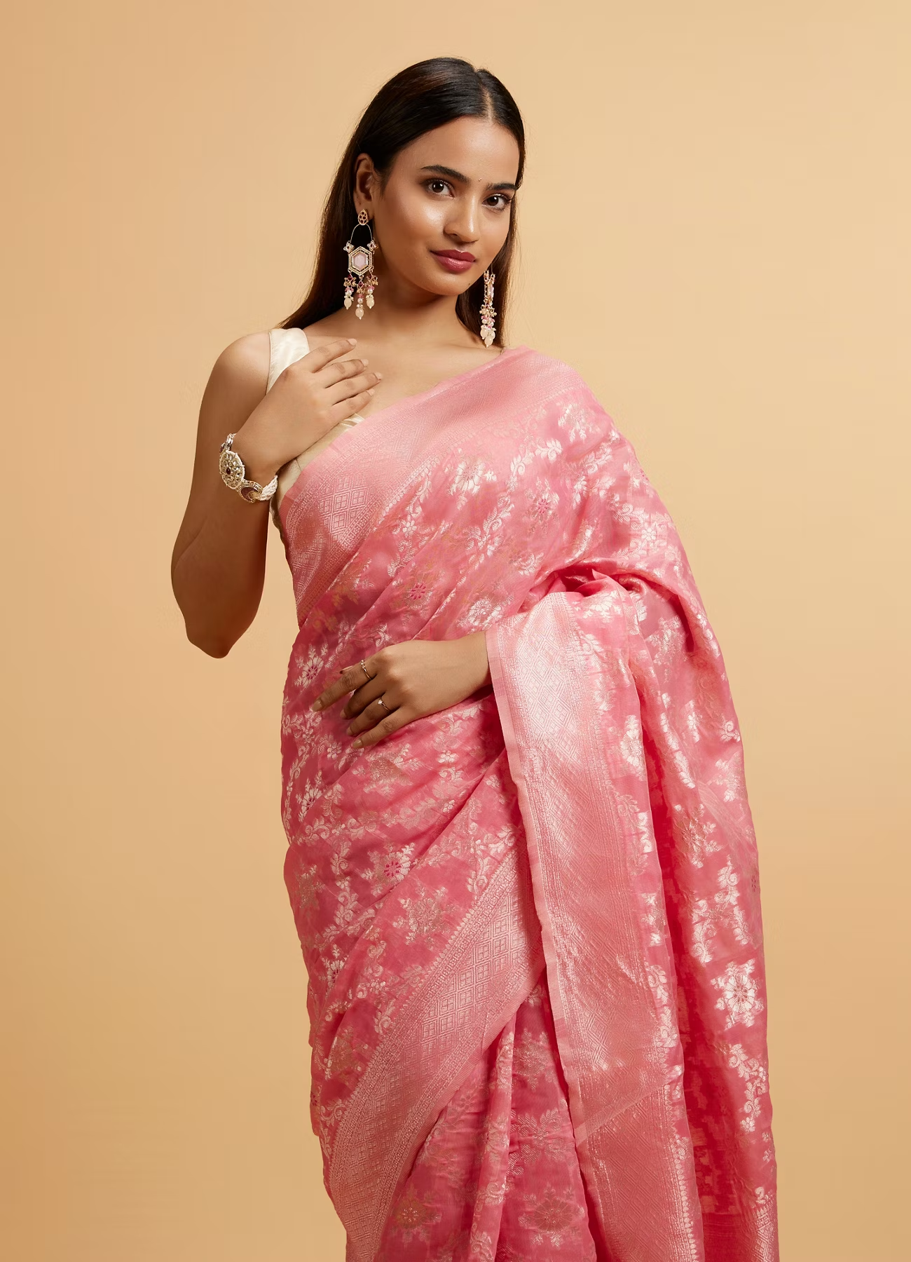 - DescriptionThis pink floral jaal patterned saree is the perfect pick to elevate your elegance. Crafted from premium fabric, this saree features intricate floral motifs in a delicate jaal pattern, exuding timeless charm and sophistication. Perfect for festive occasions or intimate gatherings, its soft hues and detailed artistry make it a standout piece. Pair it with a contrasting blouse and statement jewelry for a stunning look that captures effortless grace.