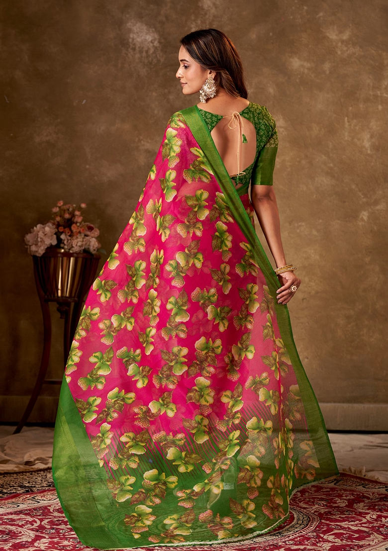 Pink Printed Cotton Saree Set
