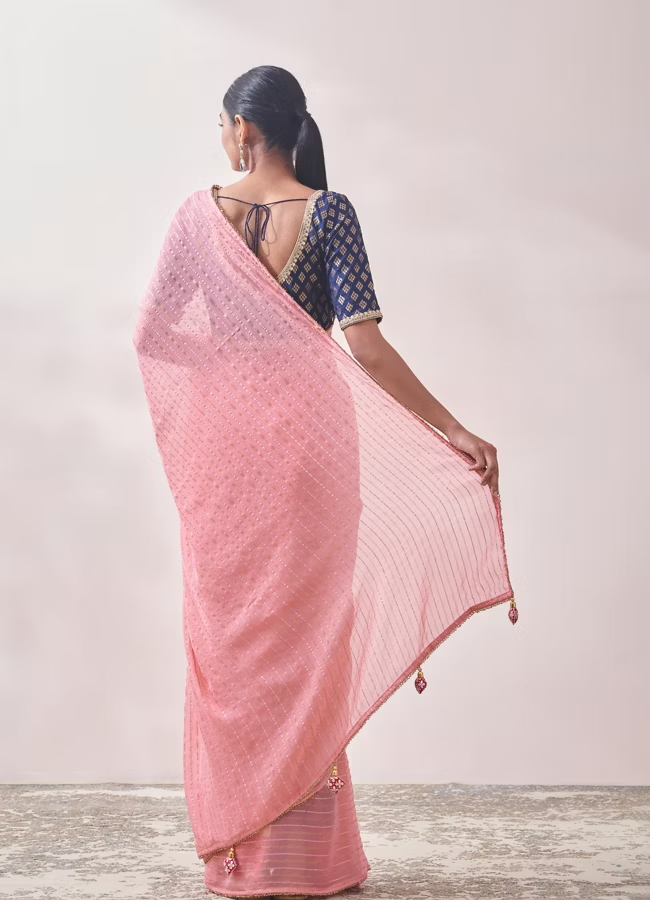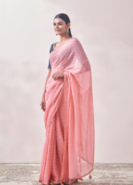 - DescriptionDazzle in our radiant pink Georgette saree, ideal for Sangeet & Reception. This elegant drape exudes a delicate charm with its rich hue and lightweight fabric, making it a compelling choice for festive celebrations. Show off your style and grace with this eye-catching piece.
