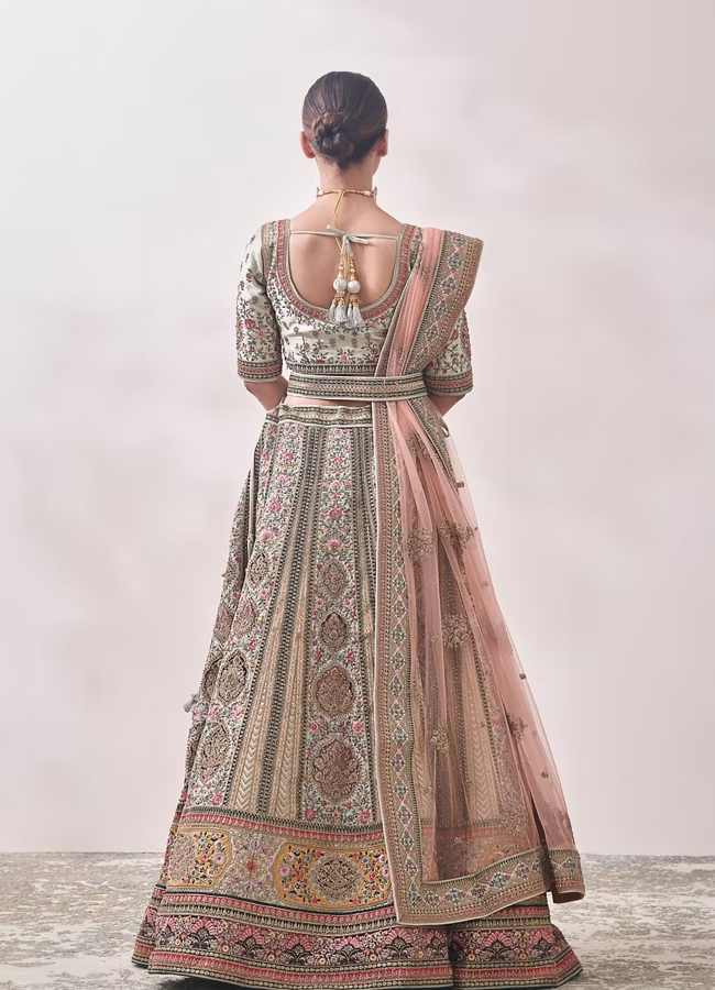 - DescriptionAn enchanting medley of colourful floral embroidery interspersed with ornate gilded motifs are handcrafted onto this pistachio green Silk Blend lehenga. Contrasting colours highlight the border of the panelled skirt and umbrella trims festoon the waist tie. The blouse is outlined with a sweetheart neck and a scoop back adorned with a tasselled dori. A matching waist belt and a contrasting coral pink net dupatta are paired with this royal bridal attire.