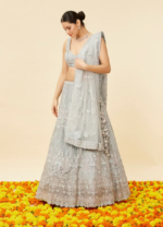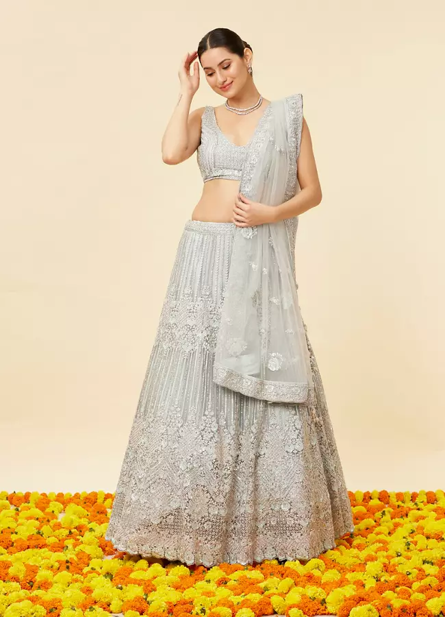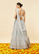 - DescriptionImmerse in the celestial glow of this powder blue lehenga. The U neck embroidered blouse beautifully aligns with the Kali cut of the lehenga skirt. An embroidered net dupatta completes this celestial ensemble.