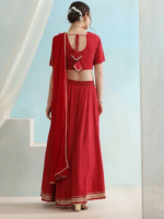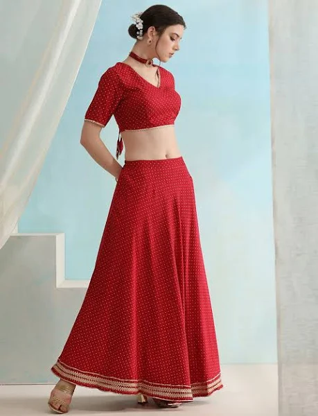 Red and gold-toned printed lehenga choli with dupatta, gotta patti