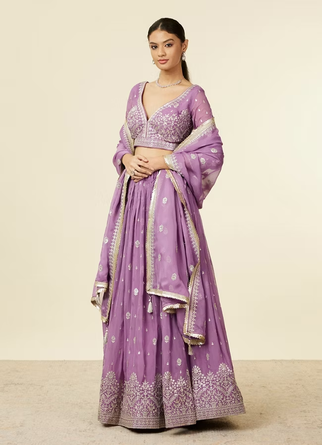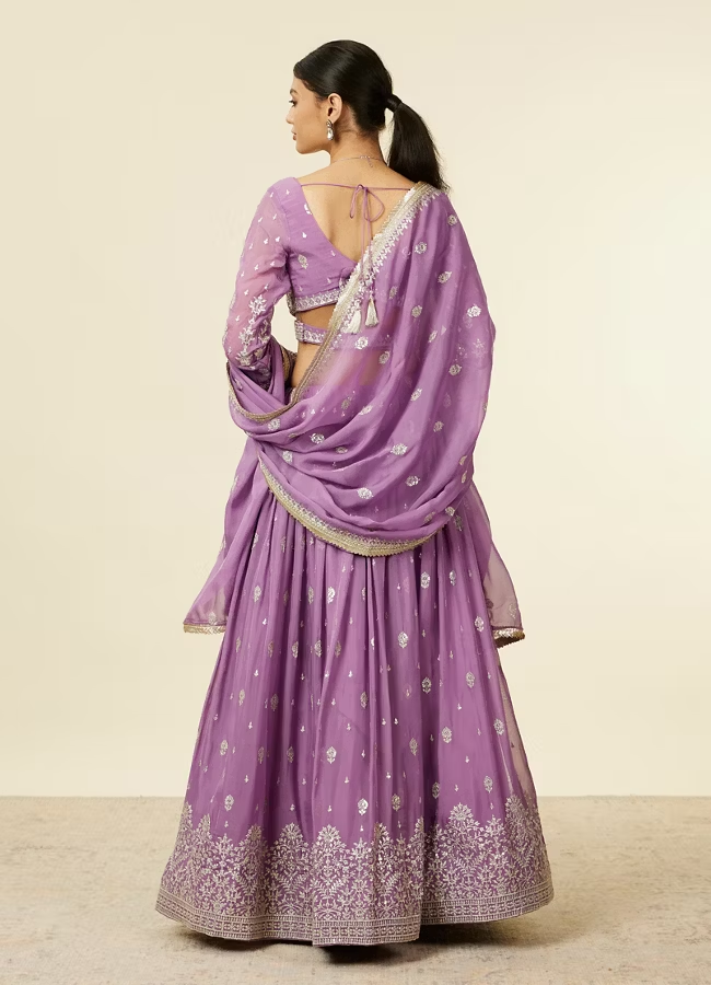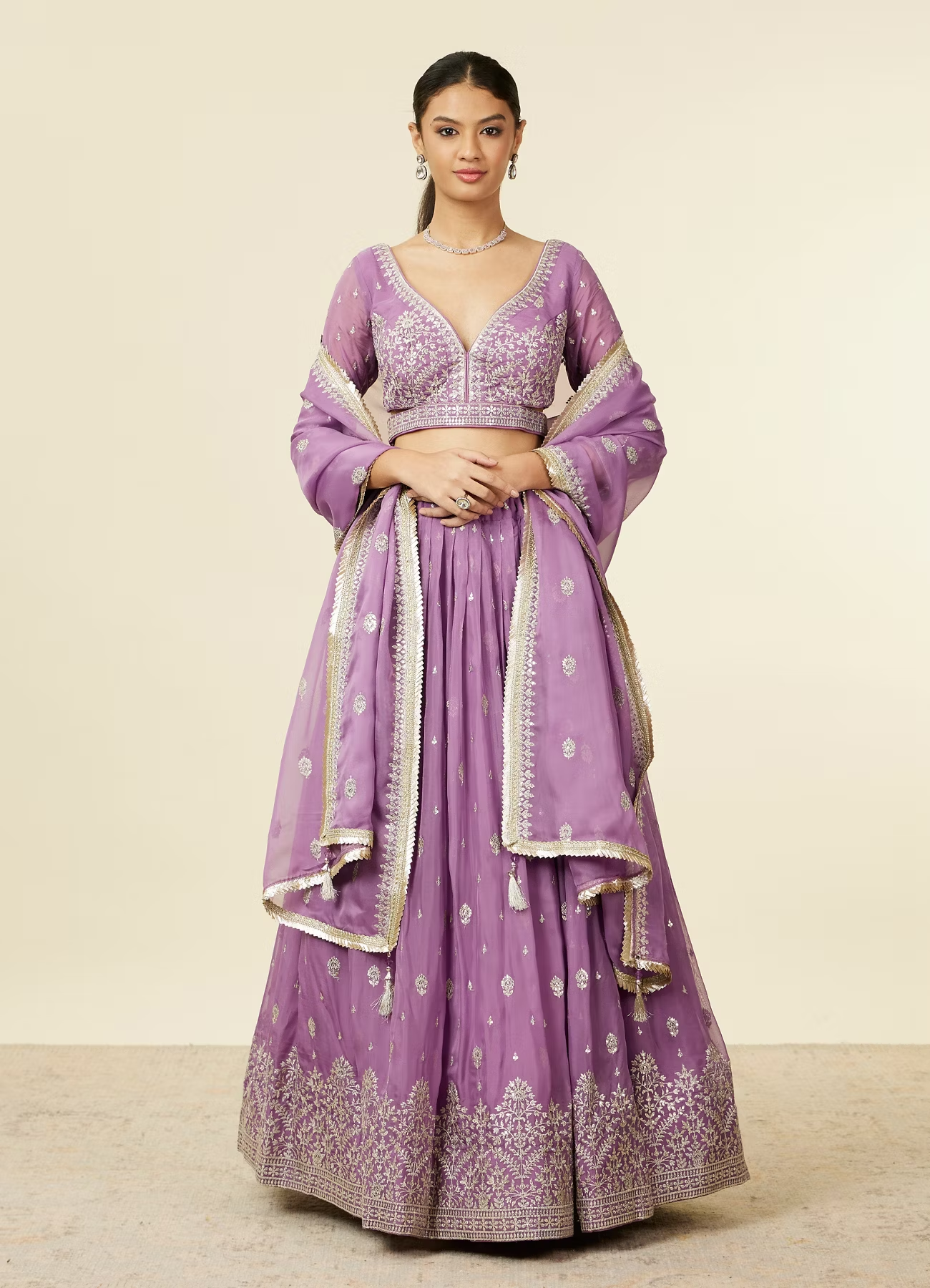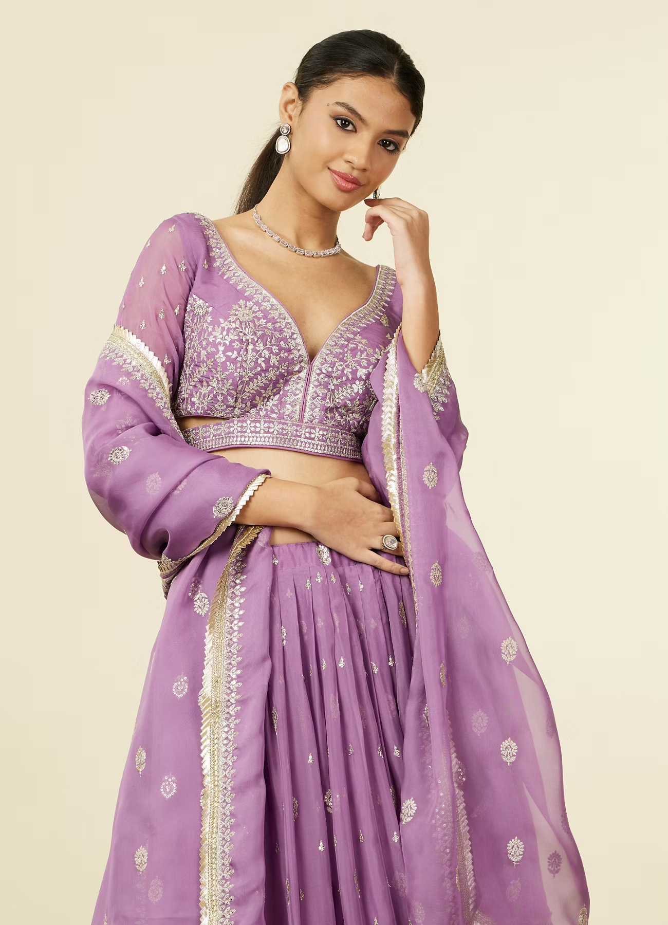 - DescriptionPaired with a skirt that features bel buti borders and floral buta motifs throughout, this purple lehenga lehenga boasts a sweetheart neckline blouse adorned with an all-over floral and bel buti pattern. A sequin-embellished waist belt adds a touch of glamour, while a complementary dupatta with floral buta motifs and golden borders completes the ensemble. Elevate this look with golden jhumkas and a sleek updo to accentuate the neckline and intricate patterns, perfect for weddings or festive occasions.