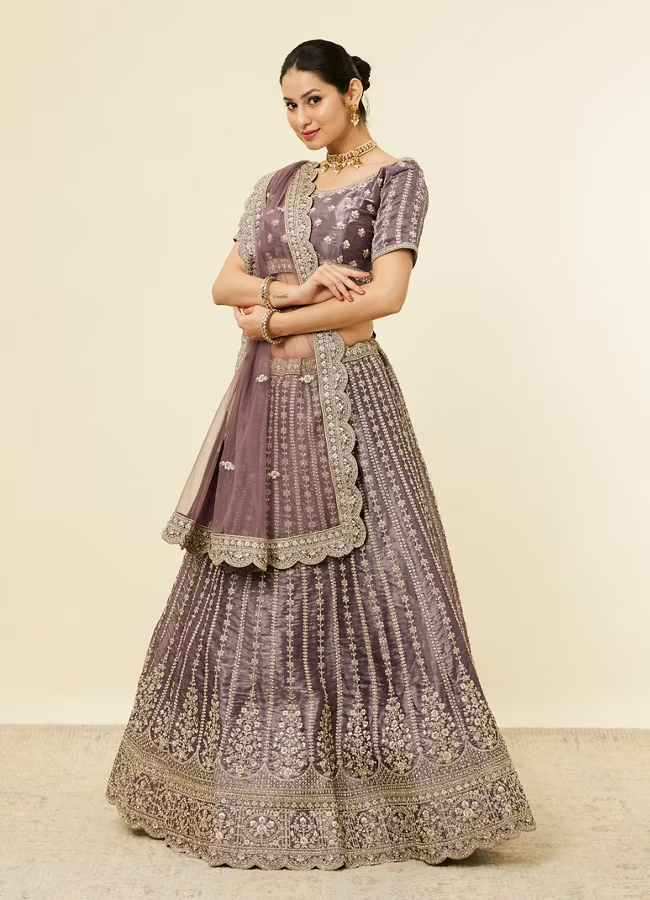- DescriptionFeaturing a kali cut skirt, this purple lehenga is adorned with exquisite floral aari embroidery and stone embellishments. The ensemble is completed with a matching embroidered blouse and net dupatta with embroidered borders, creating a cohesive and elegant look. Pair with antique finish gold jewellery to complement the embroidery. Ideal for evening celebrations, this lehenga combines traditional elegance with a touch of modern flair.