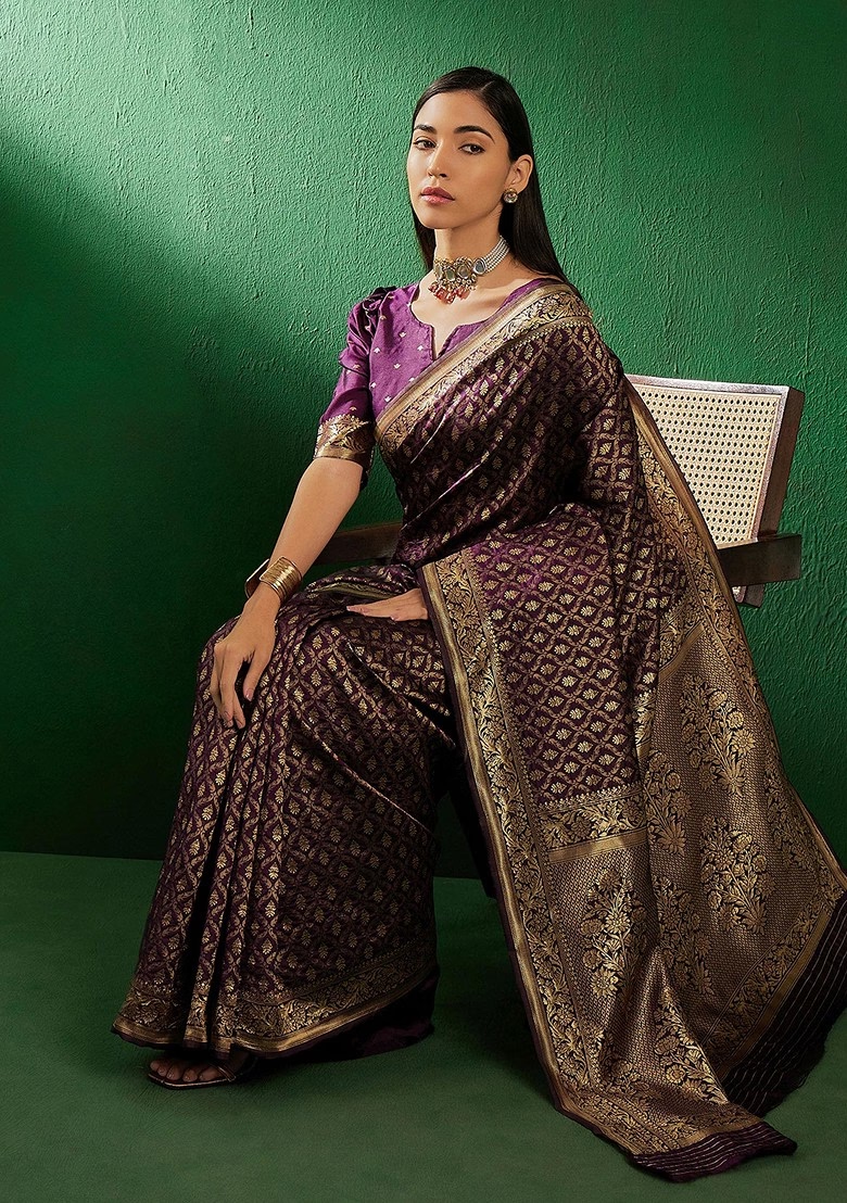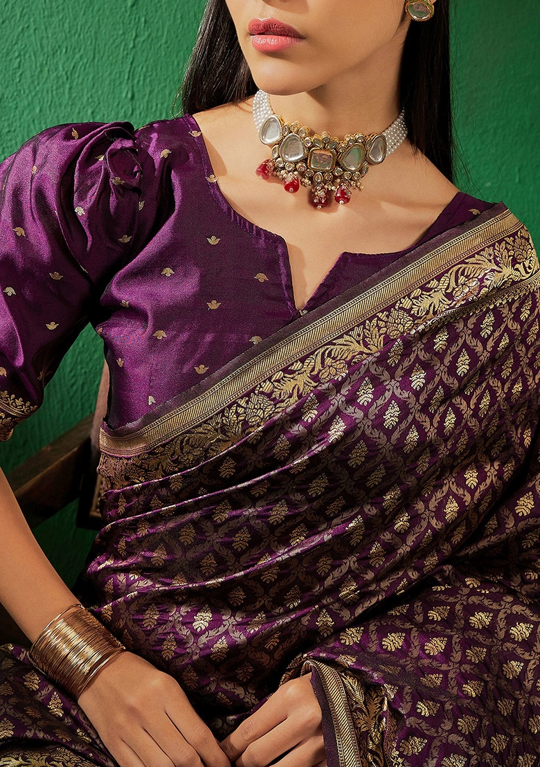 Purple Woven Jaal Work Banarasi Silk Saree Set