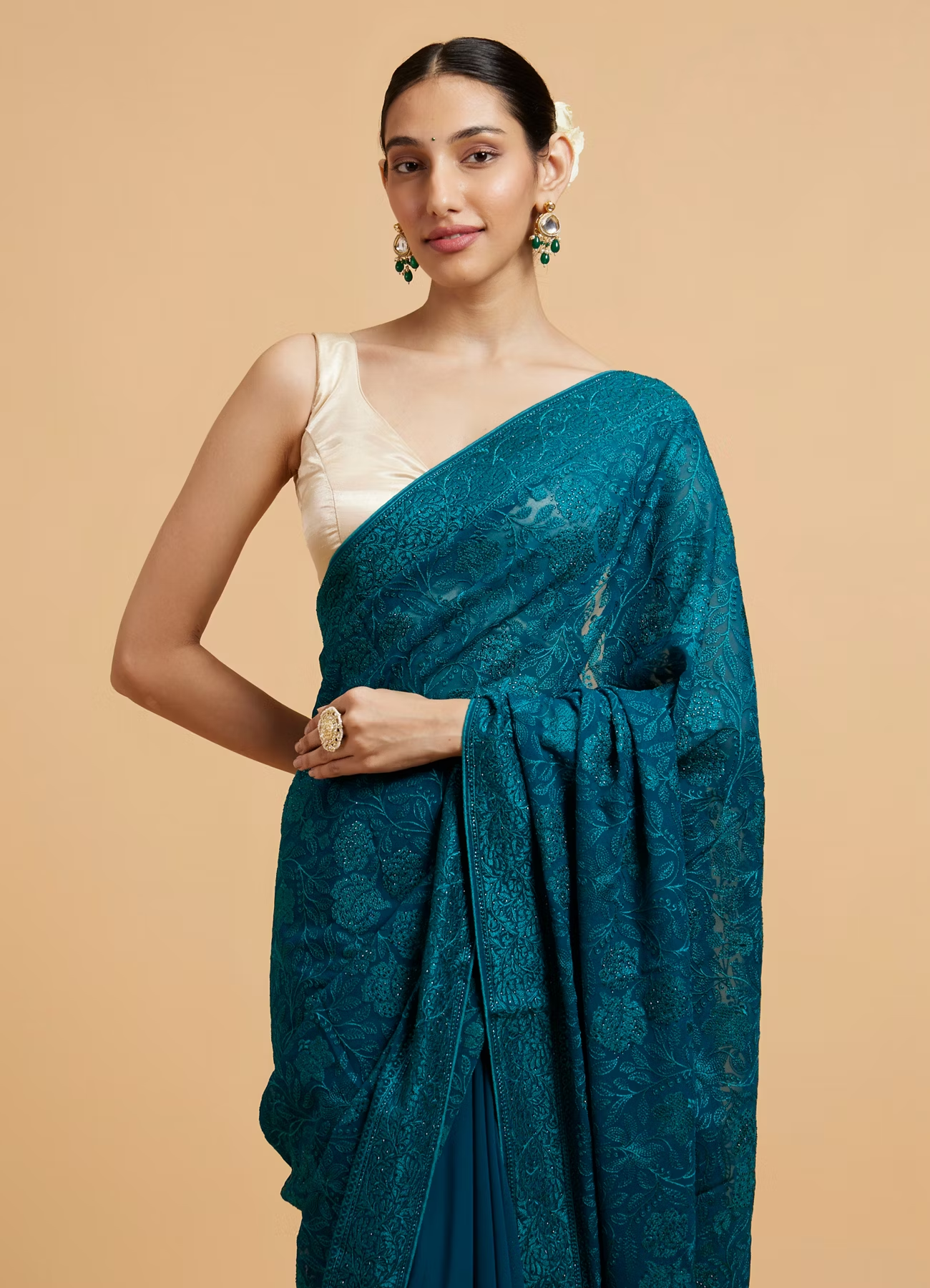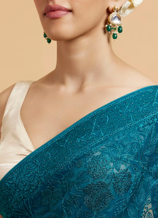 - DescriptionStep into elegance with this rama green bel buti embroidered saree, intricately adorned with rhinestones. The delicate bel buti motifs add a charm, while the shimmering rhinestones elevate its glam quotient. Crafted in a lightweight fabric, it drapes beautifully, making it perfect for weddings, festive occasions, or grand celebrations. Pair it with a gold blouse and statement earrings to complete the regal look.