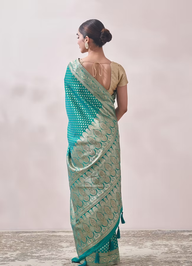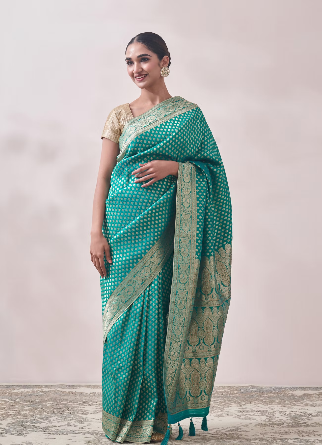 - DescriptionCelebrate the grandeur of Indian festivities with this vibrant Rama Green Saree. Crafted from luxurious silk, this saree is perfect for a mehendi ceremony or wedding attendance. Its intricate designs render an elegance that complements both traditional and contemporary styles.