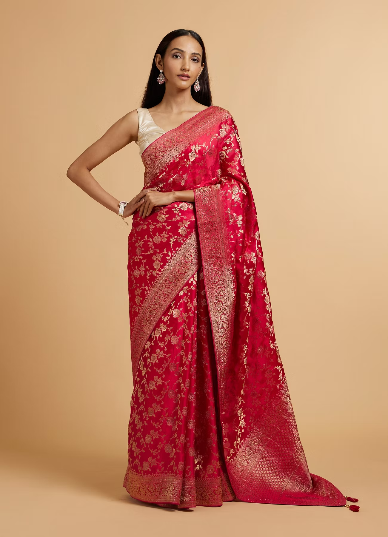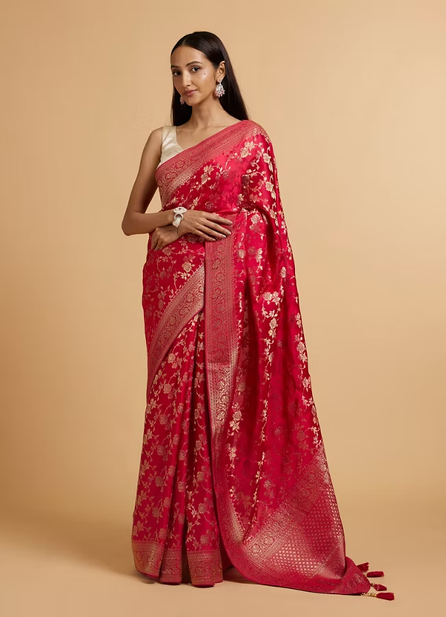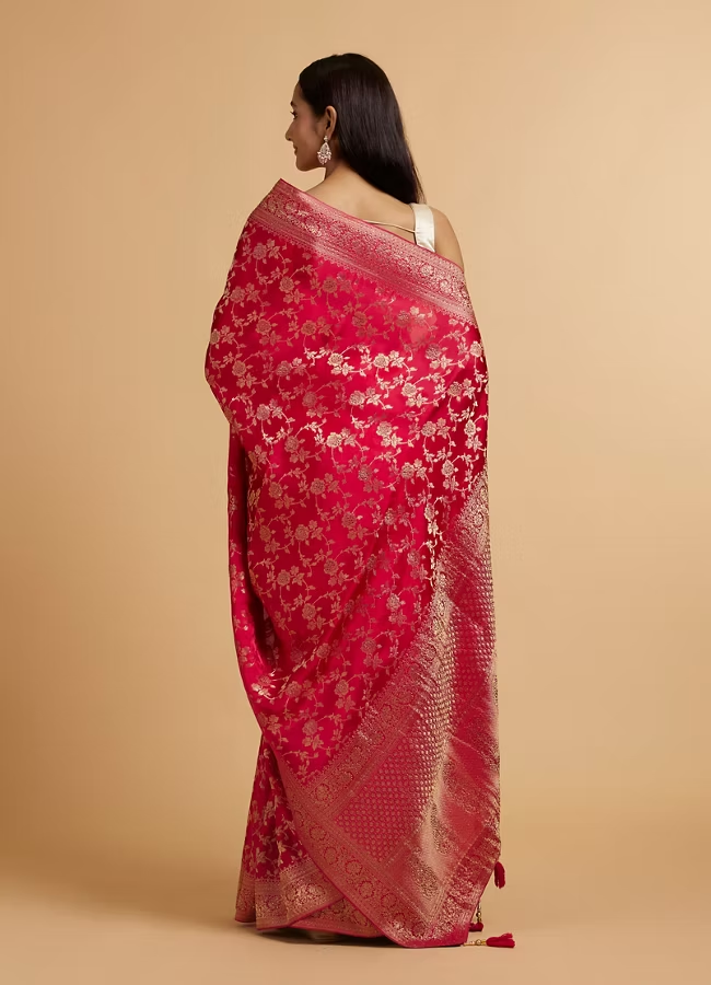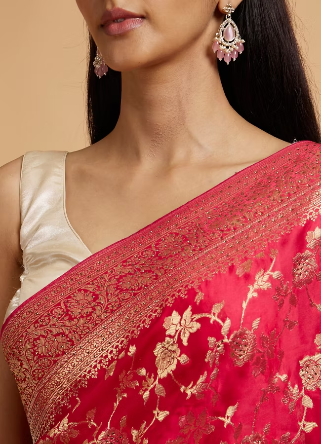 Rani Pink Bel Buti Patterned Bridal Saree with Rhinestones