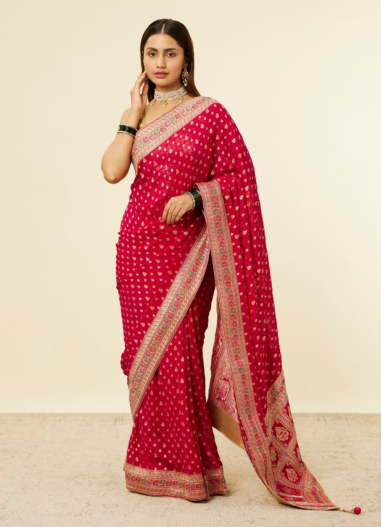 - DescriptionThis rani pink saree is a masterpiece, showcasing floral buta motifs embroidered across the saree body. The saree is further enhanced with sequin work along the floral and leaf patterned border, featuring floral embroidery. This saree is a perfect choice for traditional events and ceremonies, offering a luxurious and culturally rich appearance. Style it with traditional gold jewellery and embellished golden heels.