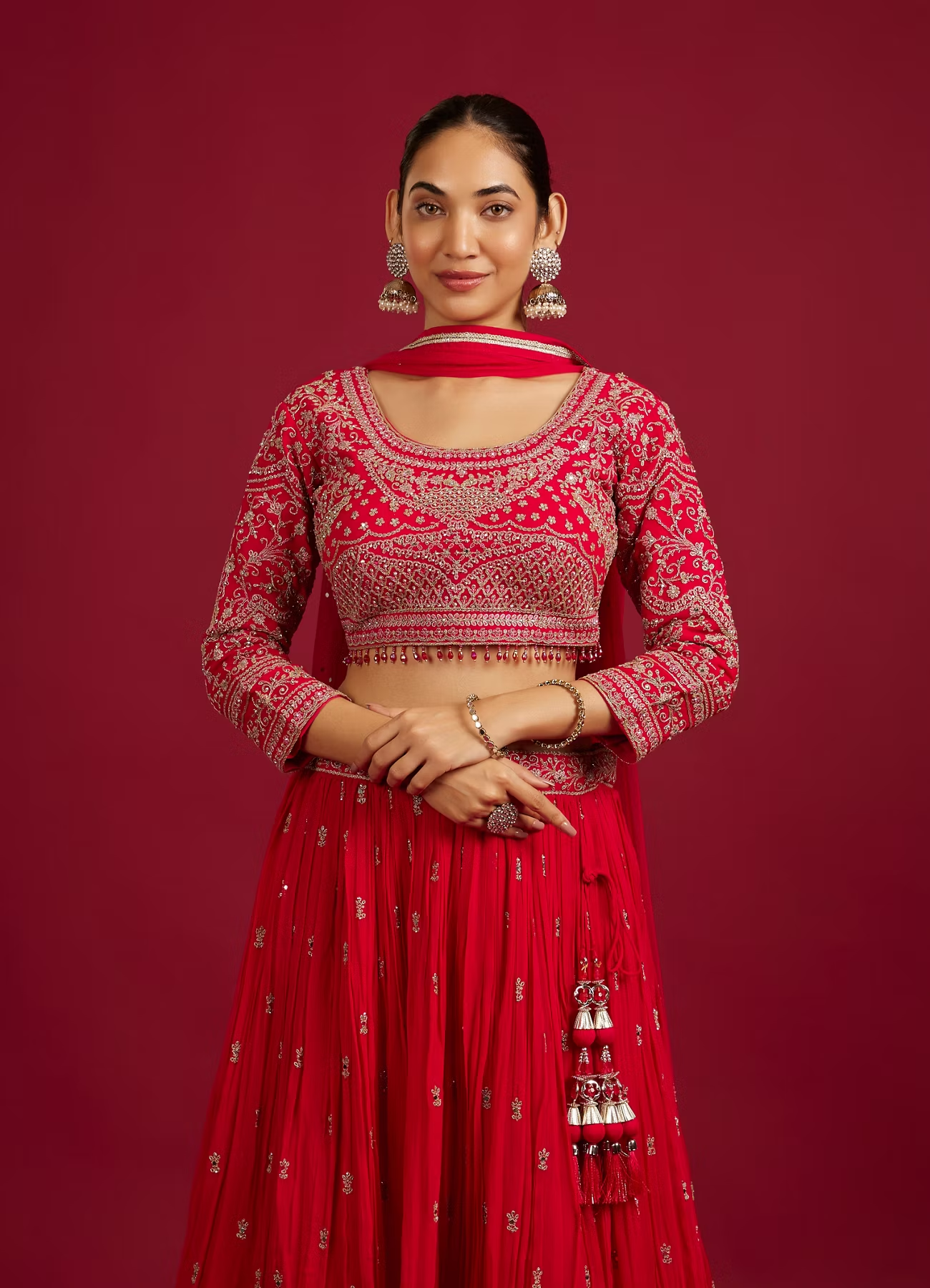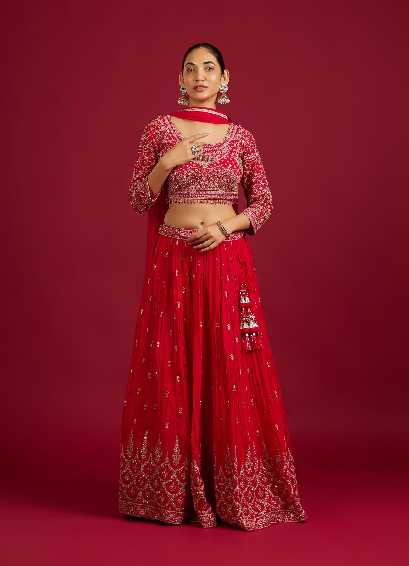 - DescriptionMake a statement in this rani red crop top lehenga, where intricate scallop zari embroidery meets dazzling sequin work. The rich fabric, paired with ornate detailing, brings a timeless touch to modern elegance. Style it with a sleek updo, statement earrings, and minimalistic heels for a look that’s both regal and effortlessly chic.