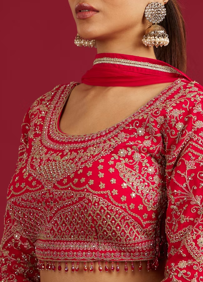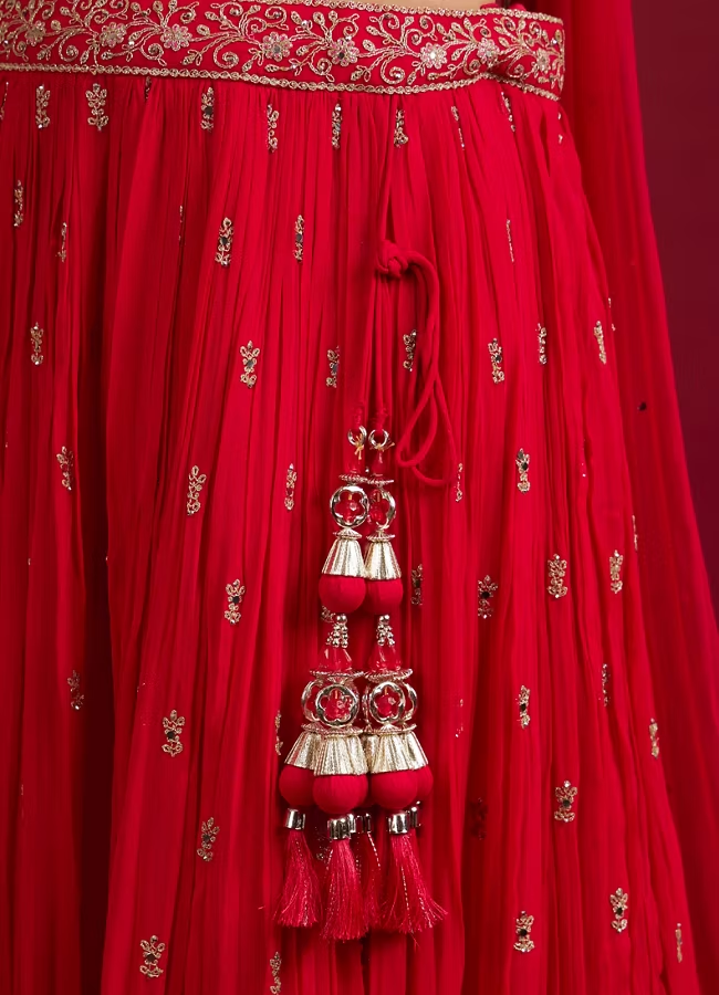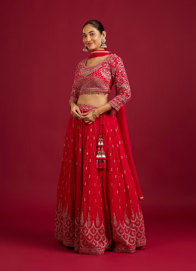 Rani Red Scallop Zari Embroidered Crop Top Lehenga with Sequin Work