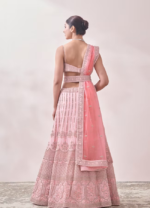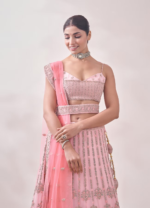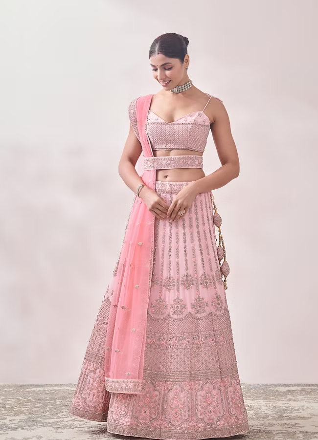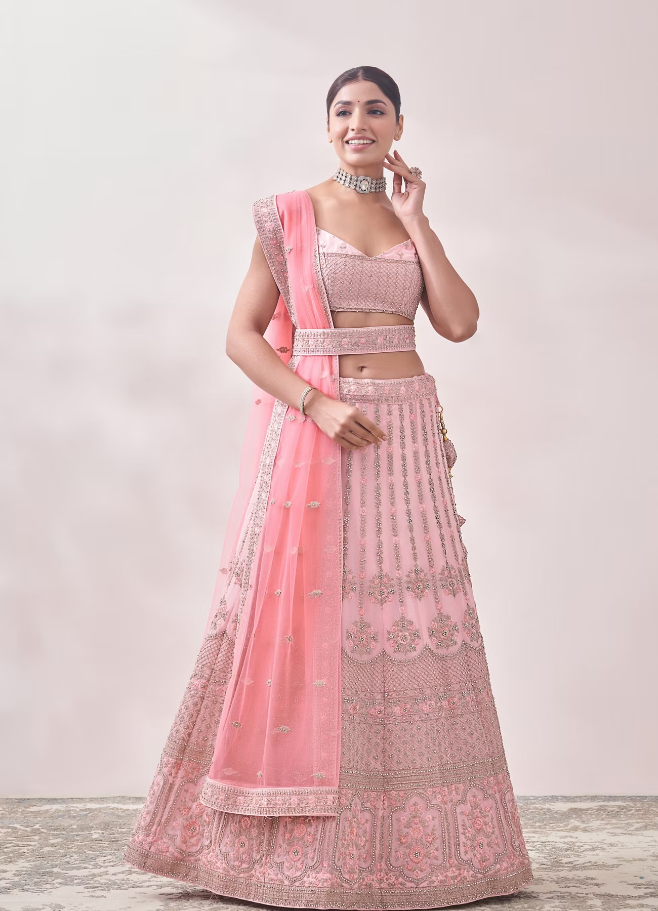 - DescriptionFashioned from breezy georgette in a pleasant rose shadow pink hue, this bridal lehenga is well suited for a summery day wedding. Illuminating rhinestone studded metallic floral embroidery and ornamental trims on the waist tie add grandeur to the skirt. Matching silver embroidery accentuates the elegant waist belt and strappy blouse, tailored with a sweetheart neckline. A spirited candy pink sheer net dupatta punctuated with embroidery and panelled with a festooned border complements the outfit.