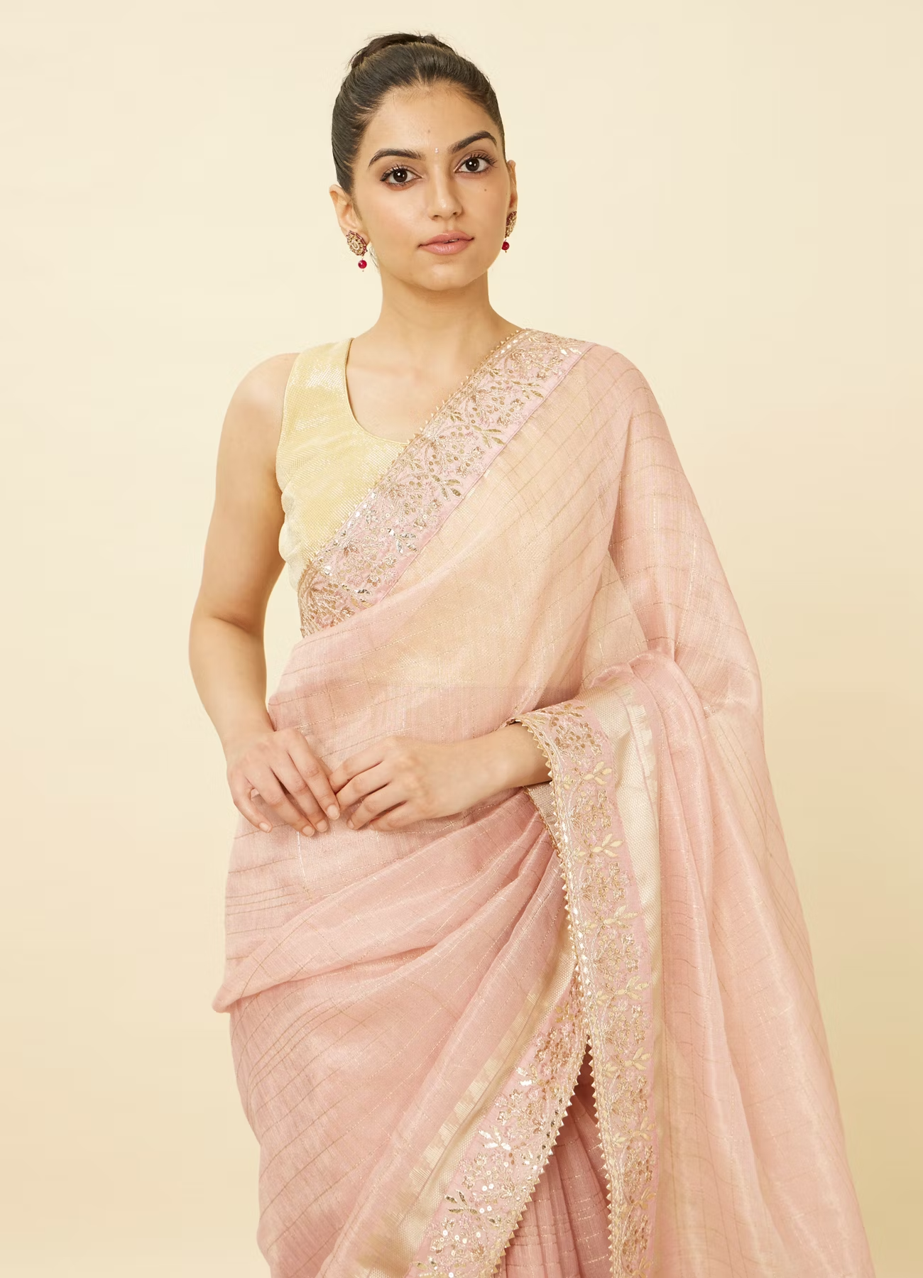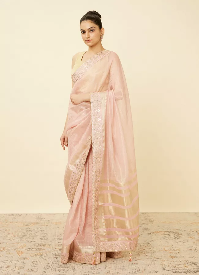 - DescriptionAdd a touch of sparkle to your ensemble with this rose shadow pink saree, designed with sequined borders and gota-patti work. Accessorise this saree with gold jewellery to enhance its glamorous appeal.