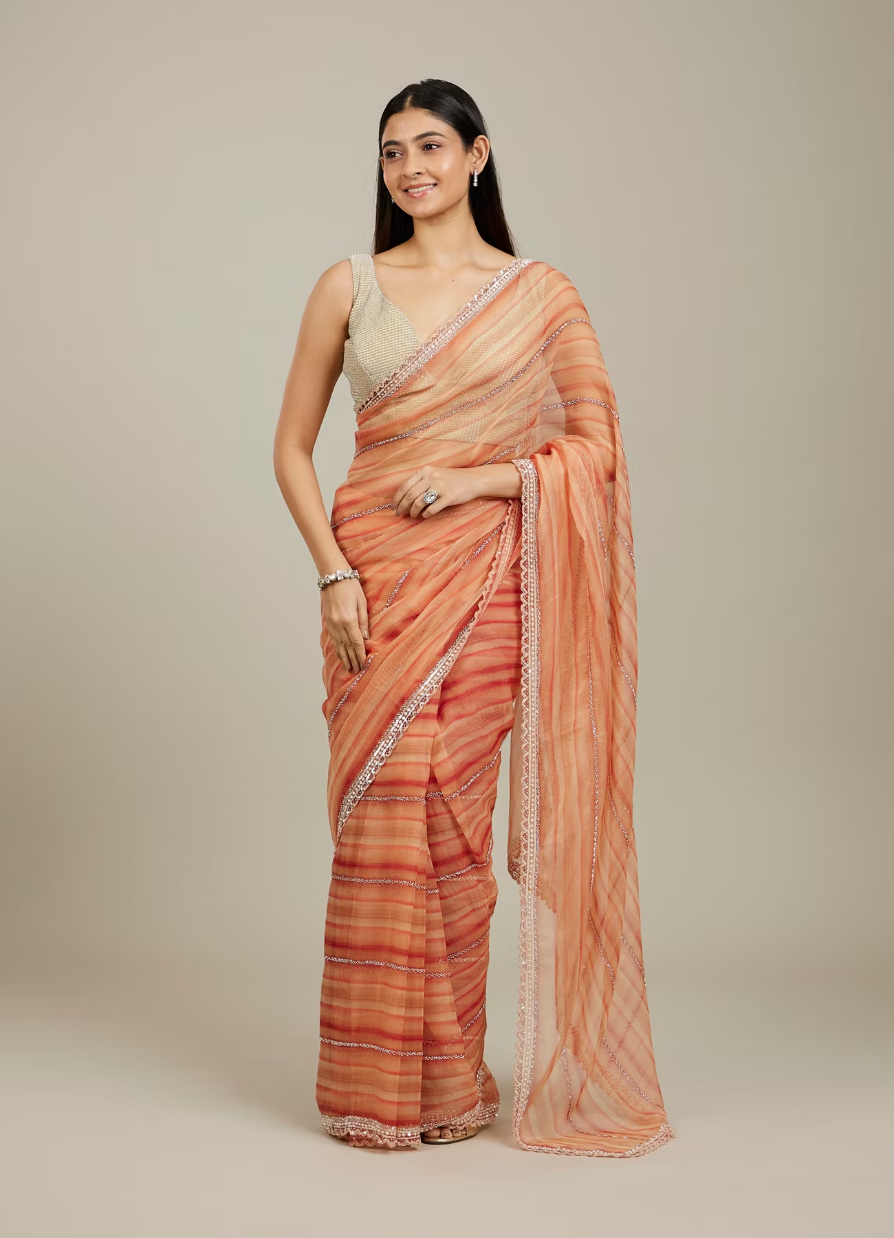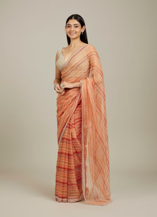 - DescriptionThis rust red diagonal striped saree blends modern design with traditional charm, featuring bold diagonal stripes that create a striking visual effect. The cutdana and sequin work delicately accentuates the fabric, adding a hint of sparkle and glamour. Pair it with a contrasting blouse in deep gold or silver, along with statement earrings, for a stunning and contemporary festive look.