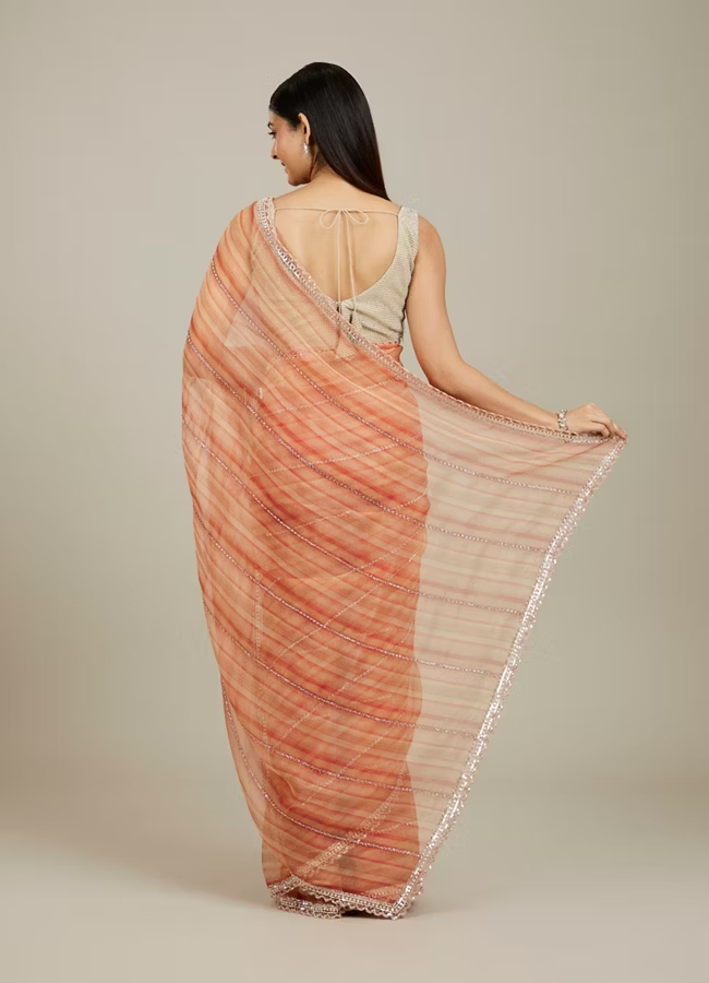 Rust Red Diagonal Striped Saree with Cutdana And Sequin Work