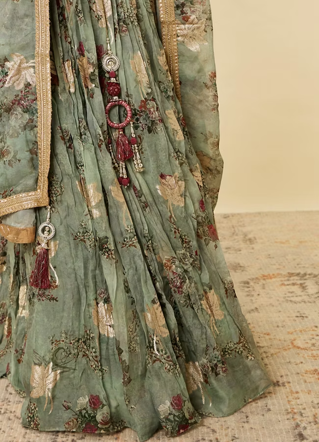 Step into the realm of elegance with this sage green Lehenga, adorned with floral prints and golden embellished borders. Pair this set with gold-toned accessories and strappy heels to create a traditional yet modern look.
